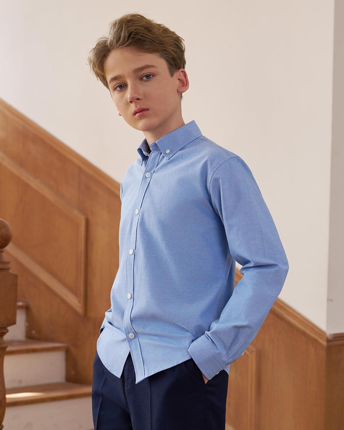 J.VER Boy's Long Sleeve Oxford Dress Shirts Solid Casual Button Down Collar Shirt Kids Formal Uniform Tops(Blue)