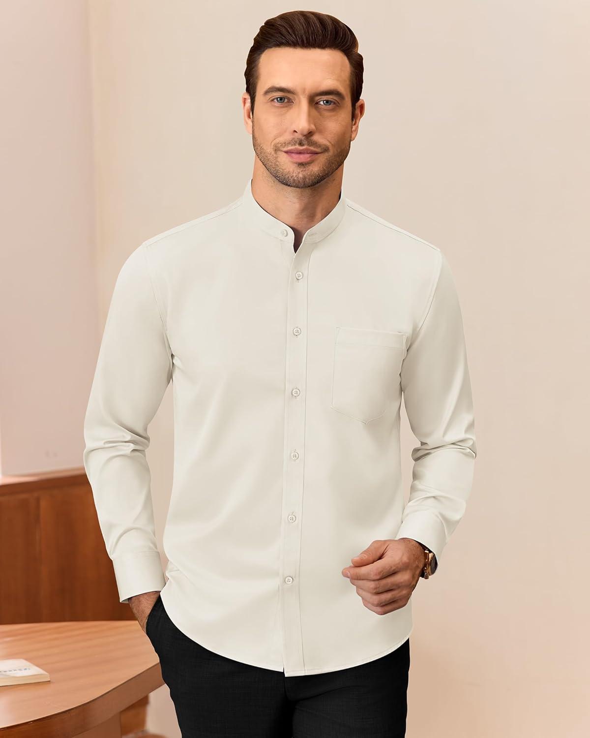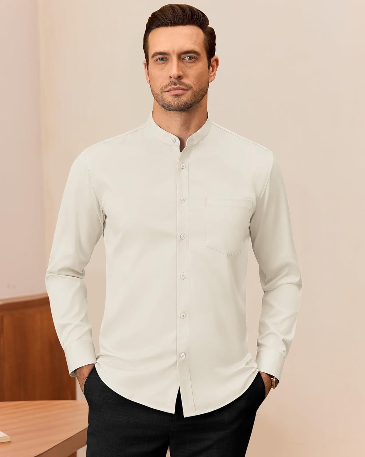 J.VER Mandarin Collar Shirts for Men Stretchy Long Sleeve Collarless Button Down Dress Shirt with Pocket(Beige Khaki)