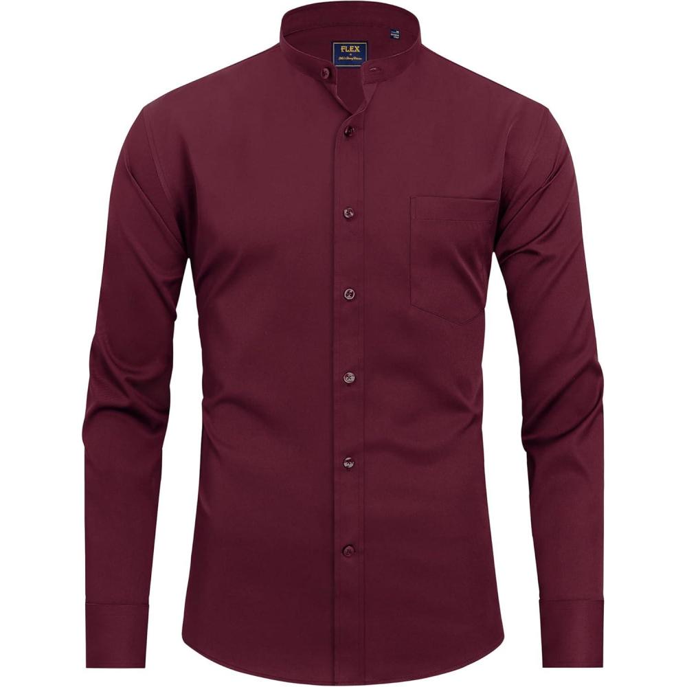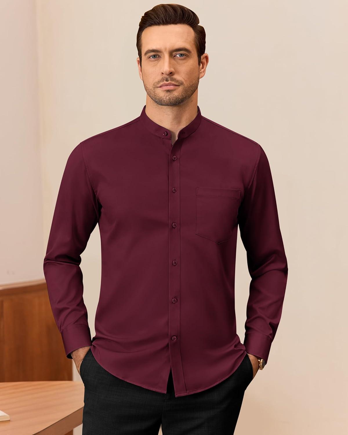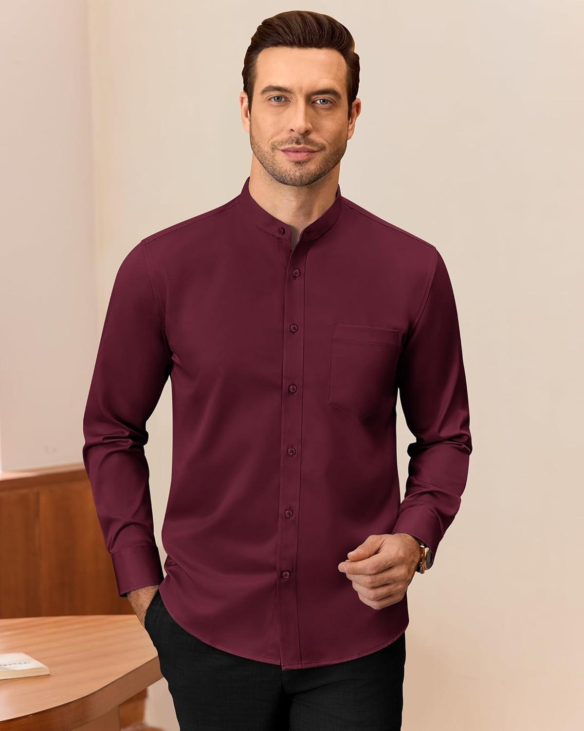 J.VER Mandarin Collar Shirts for Men Stretchy Long Sleeve Collarless Button Down Dress Shirt with Pocket(Burgundy)