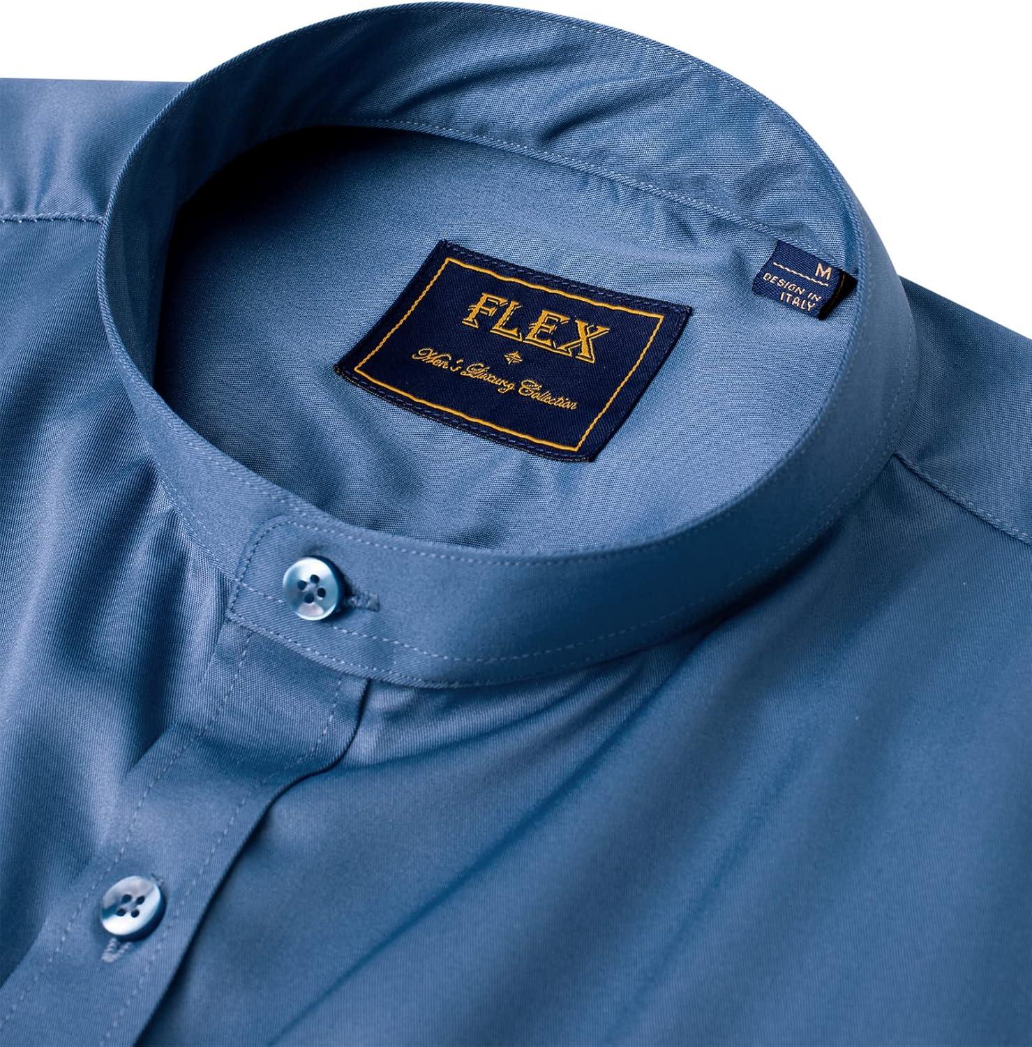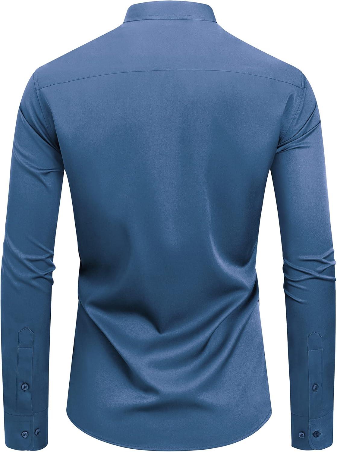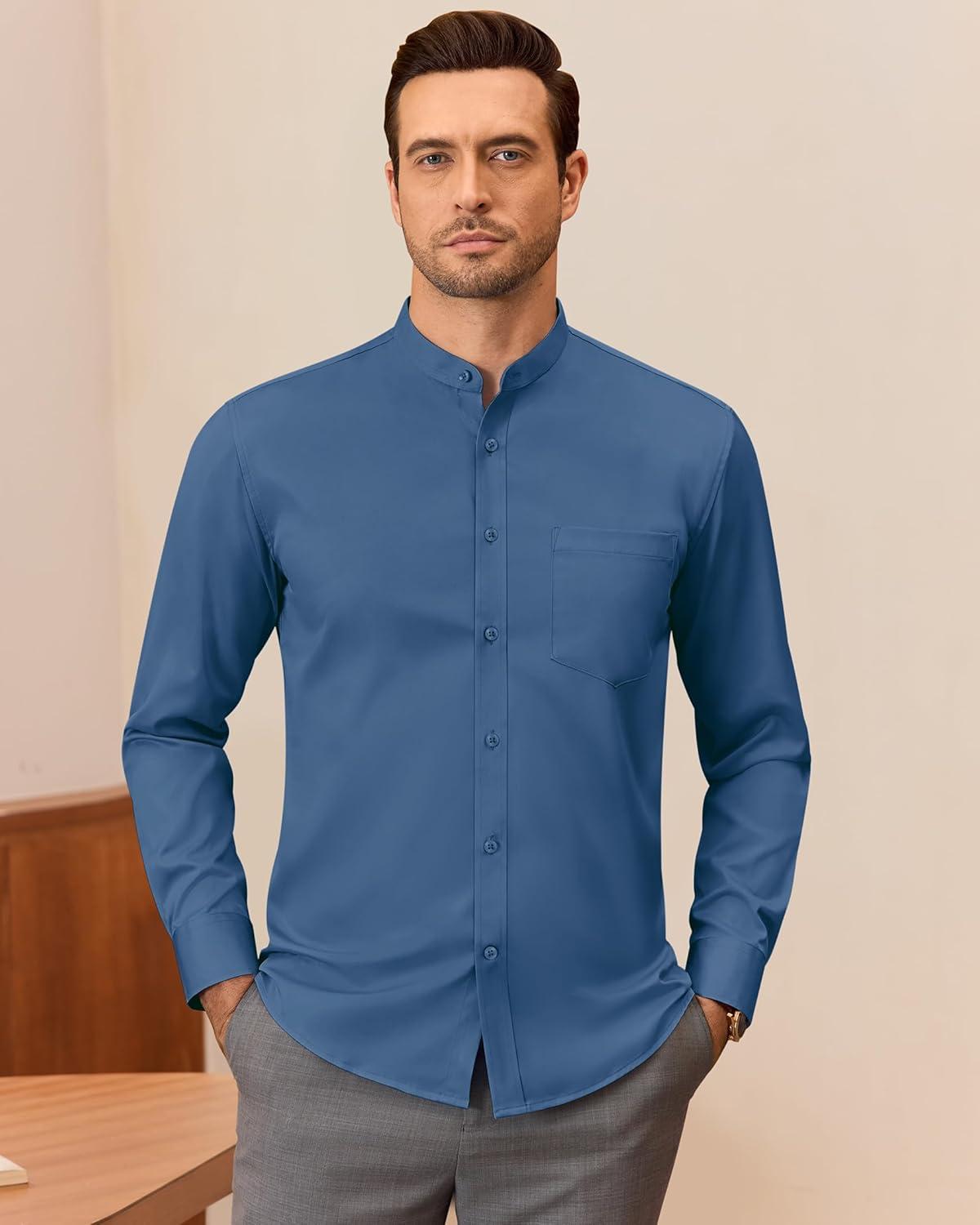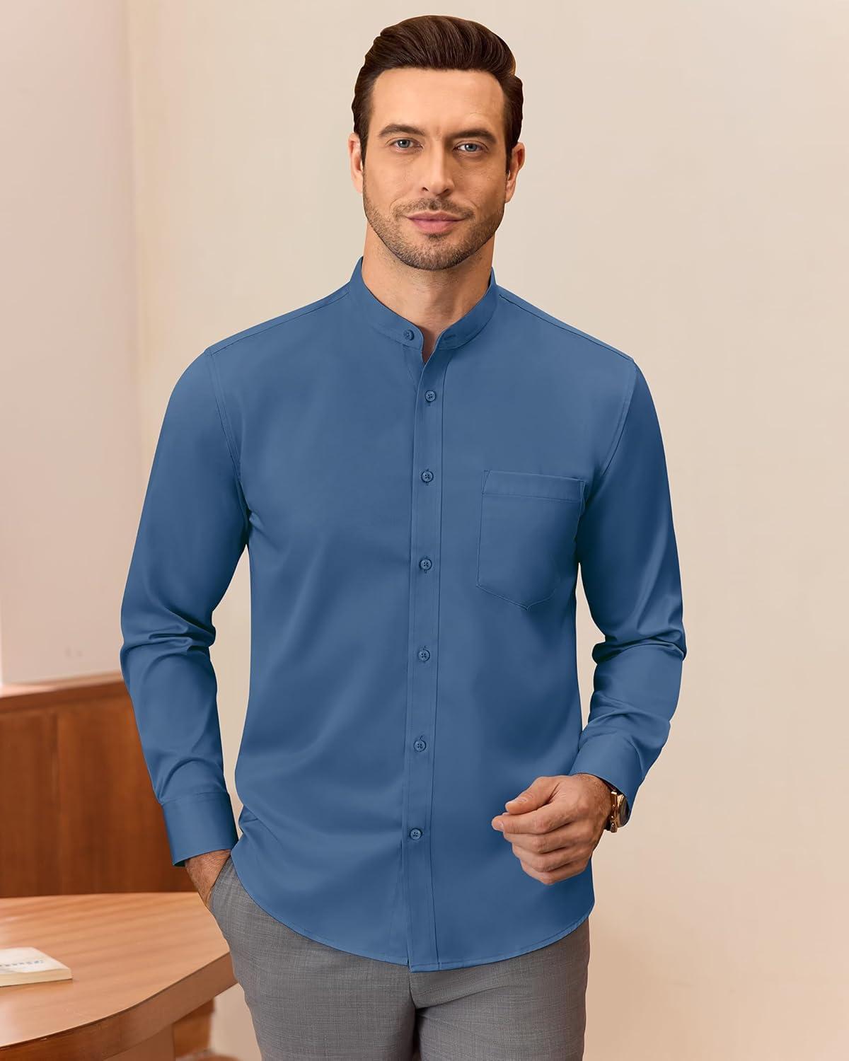 J.VER Mandarin Collar Shirts for Men Stretchy Long Sleeve Collarless Button Down Dress Shirt with Pocket(Cyan Blue)