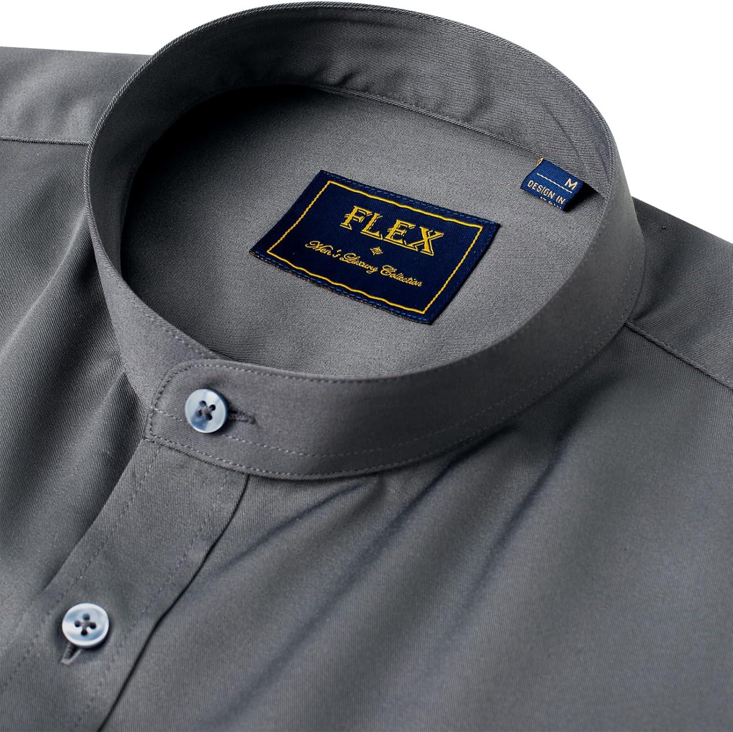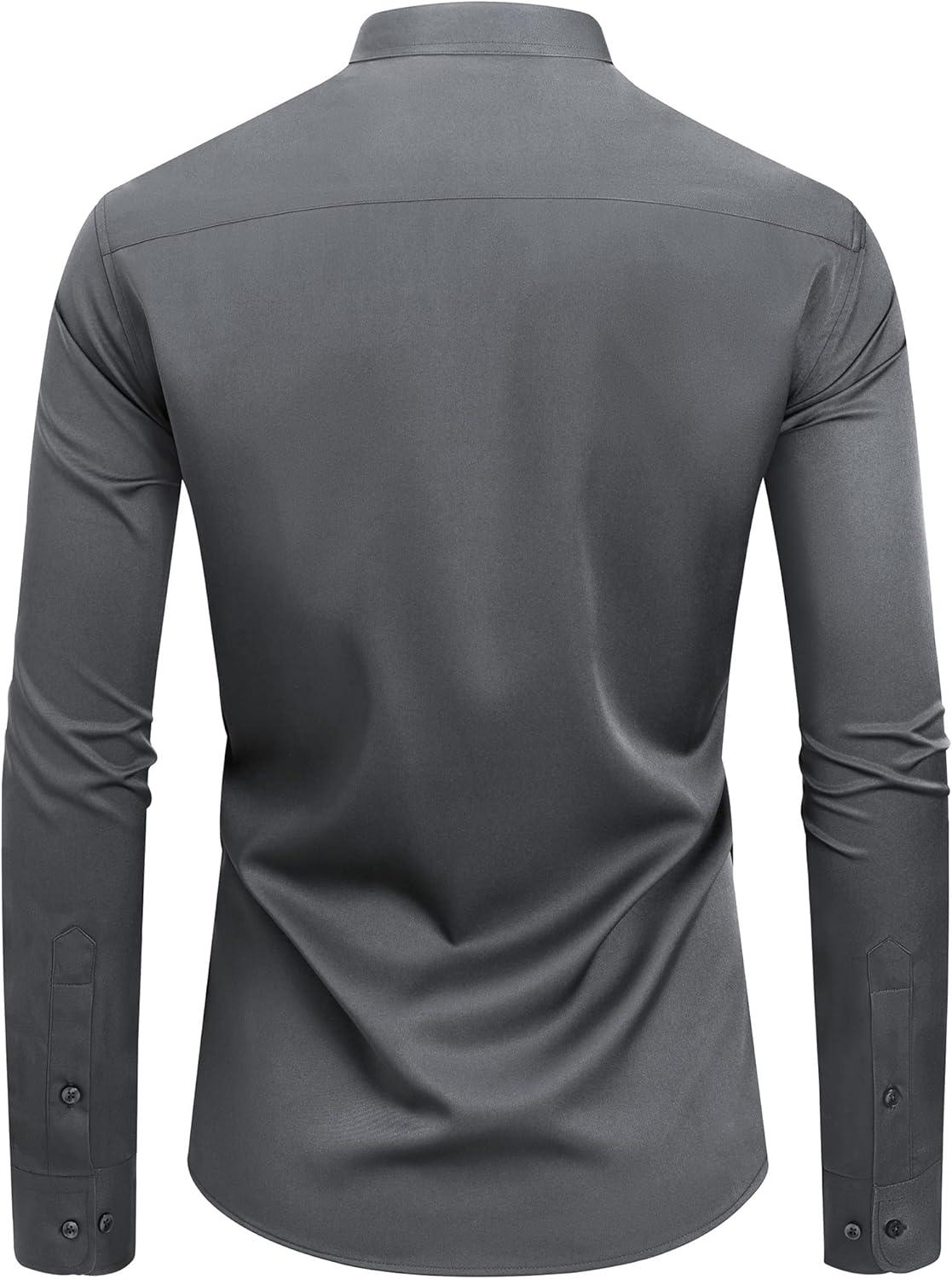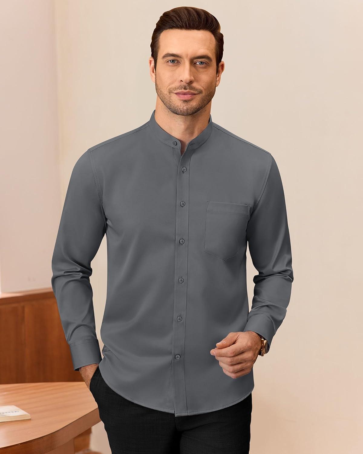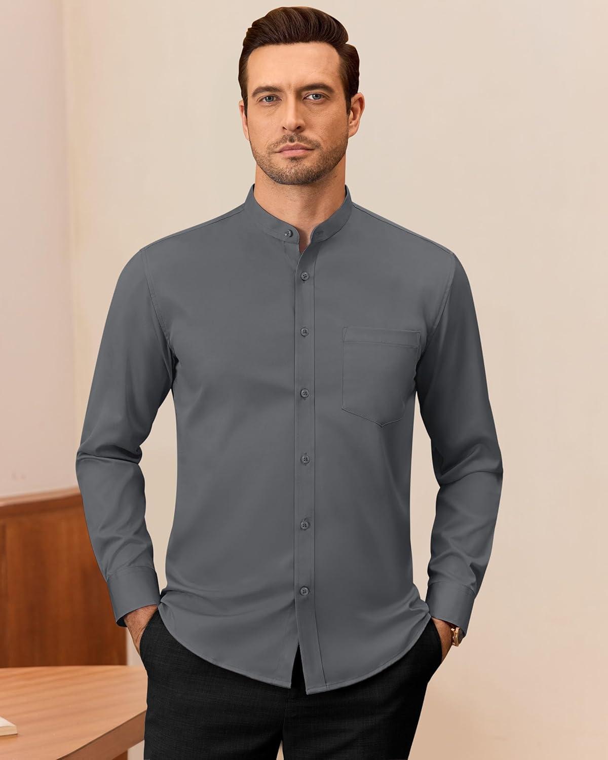 J.VER Mandarin Collar Shirts for Men Stretchy Long Sleeve Collarless Button Down Dress Shirt with Pocket(Grey)