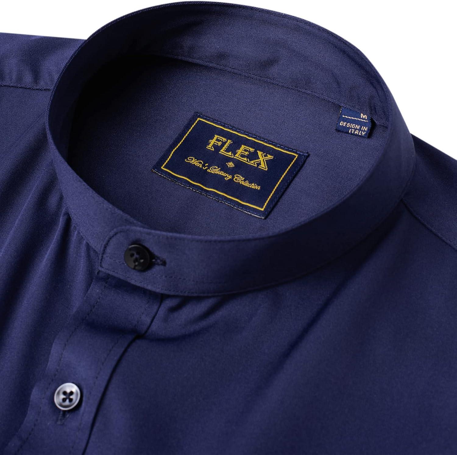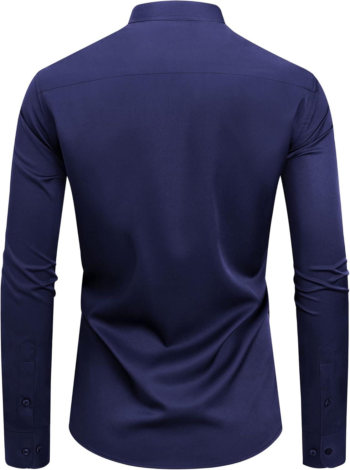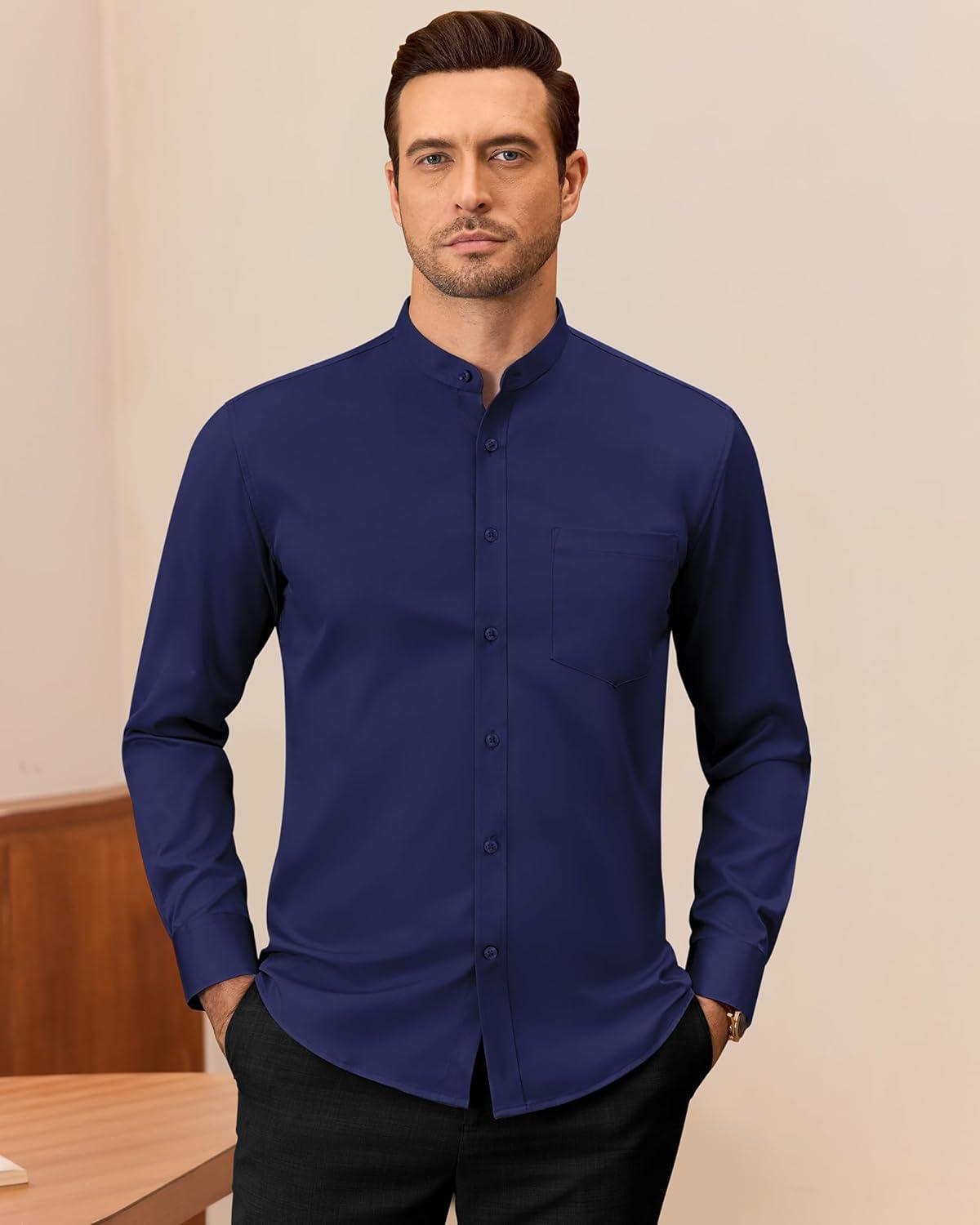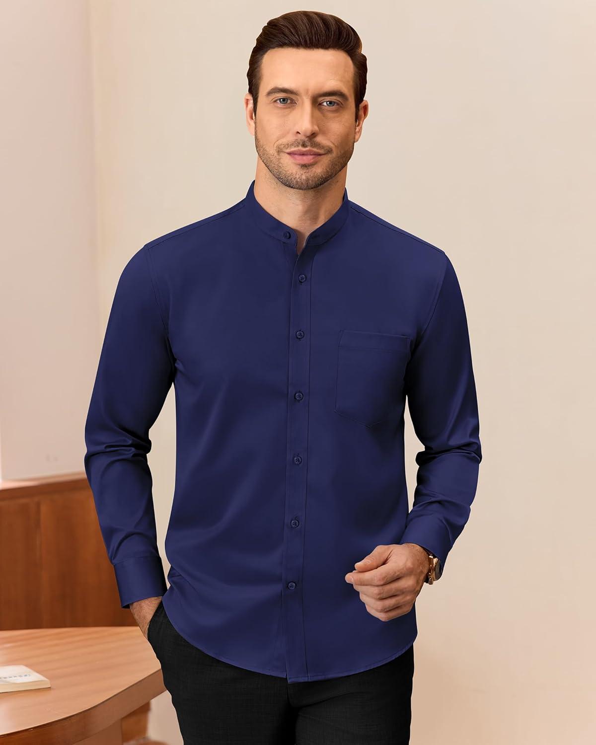 J.VER Mandarin Collar Shirts for Men Stretchy Long Sleeve Collarless Button Down Dress Shirt with Pocket(Navy Blue)