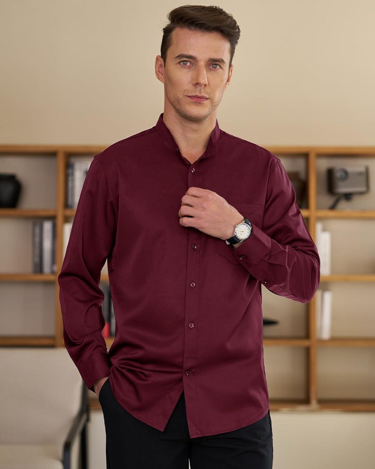 J.VER Men’s Banded Collar Dress Shirt Mandarin Long Sleeve Button Down Shirts Stretch Collarless Tops with Pocket(Burgundy)