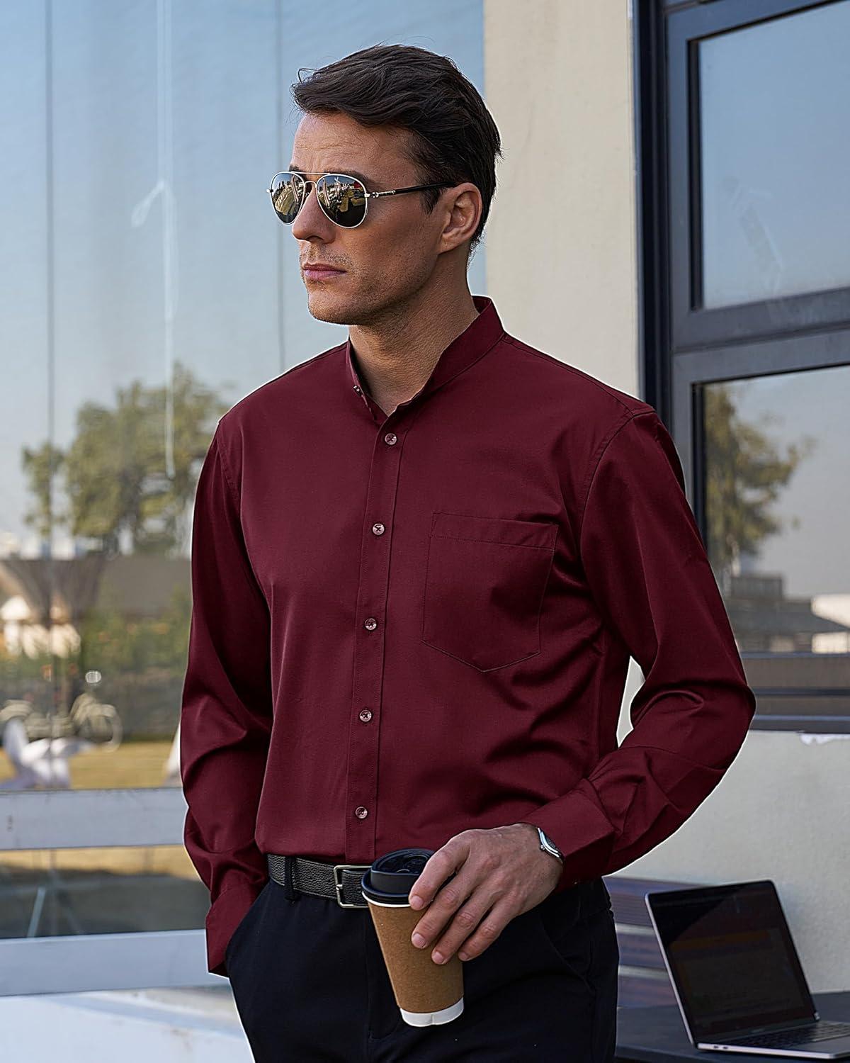 J.VER Men's Banded Collar Dress Shirt Mandarin Long Sleeve Button Down Shirts Stretch Collarless Tops with Pocket(Burgundy)
