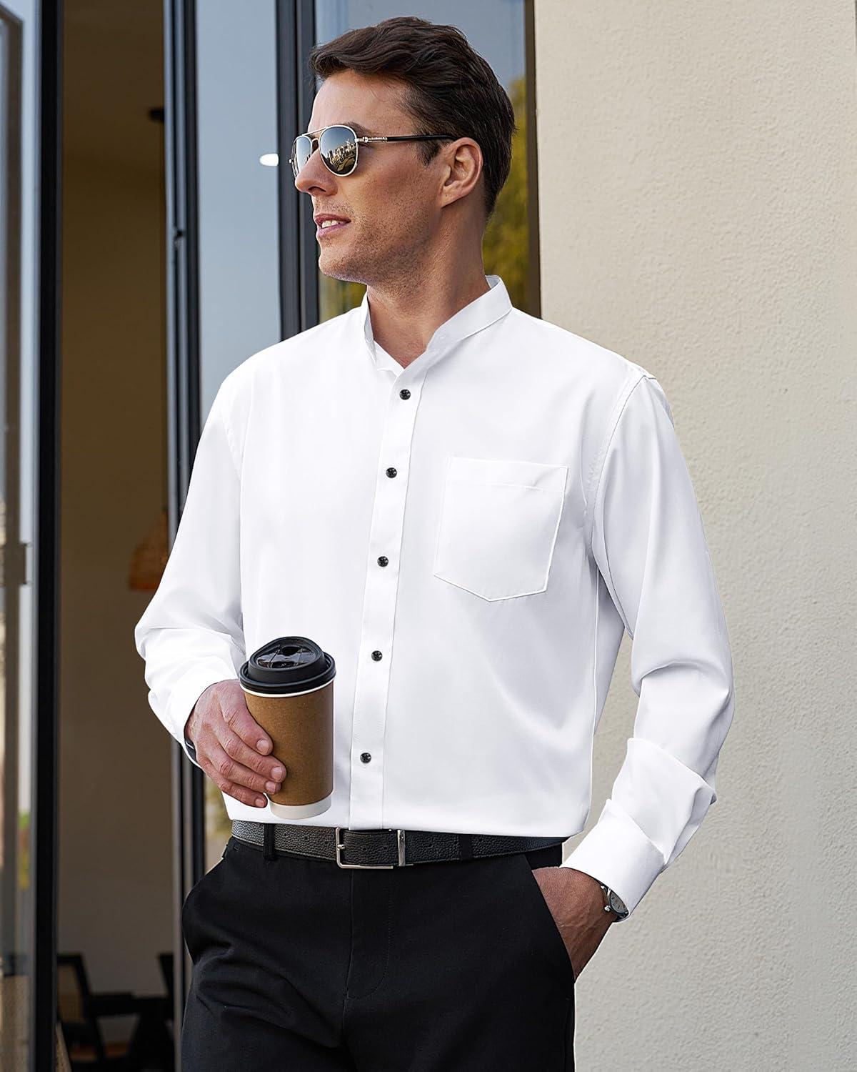 imageJVER Mens Banded Collar Dress Shirt Mandarin Long Sleeve Button Down Shirts Stretch Collarless Tops with PocketWhite Black