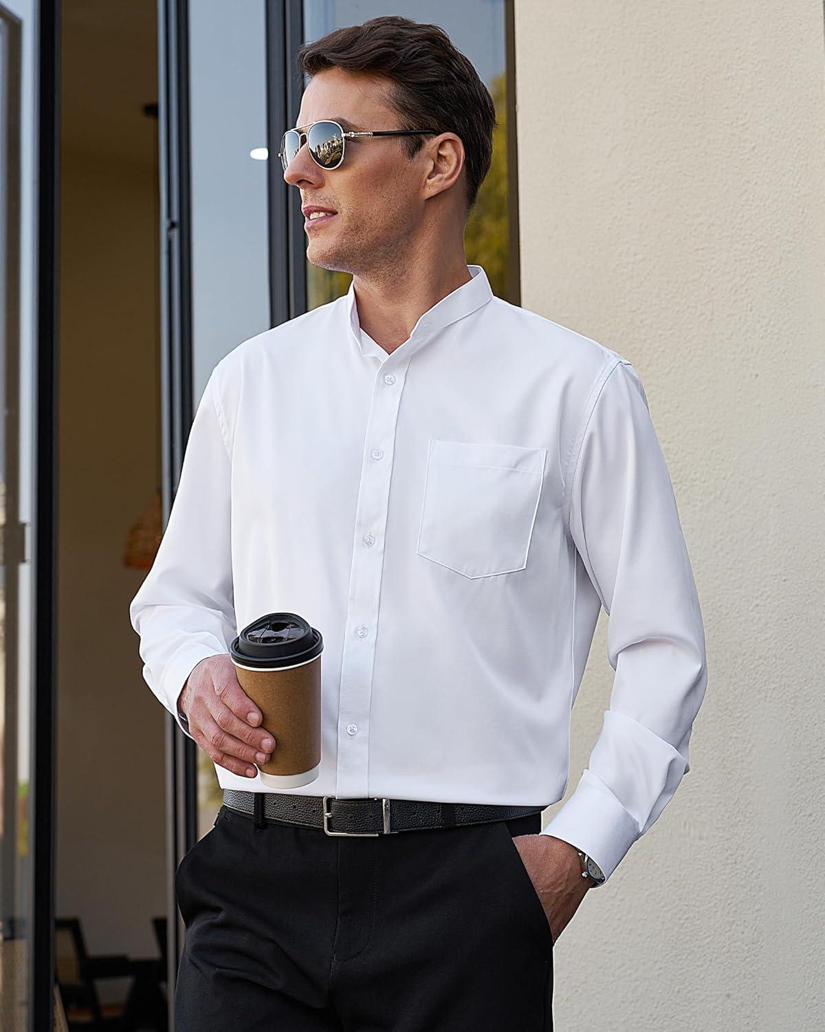 J.VER Men’s Banded Collar Dress Shirt Mandarin Long Sleeve Button Down Shirts Stretch Collarless Tops with Pocket(White)