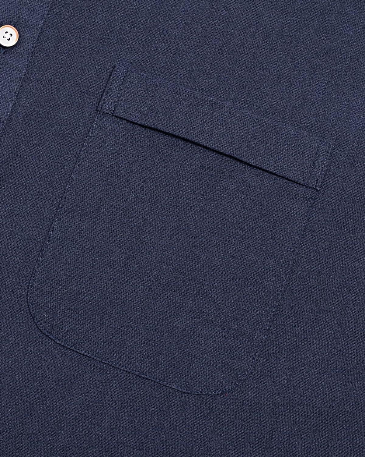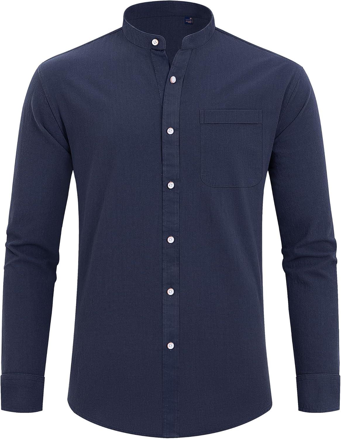 J.VER Men's Cotton Linen Long Sleeve Shirts Casual Button Down Banded Collar Shirt Beach Summer Tops with Pocket(Navy Blue)