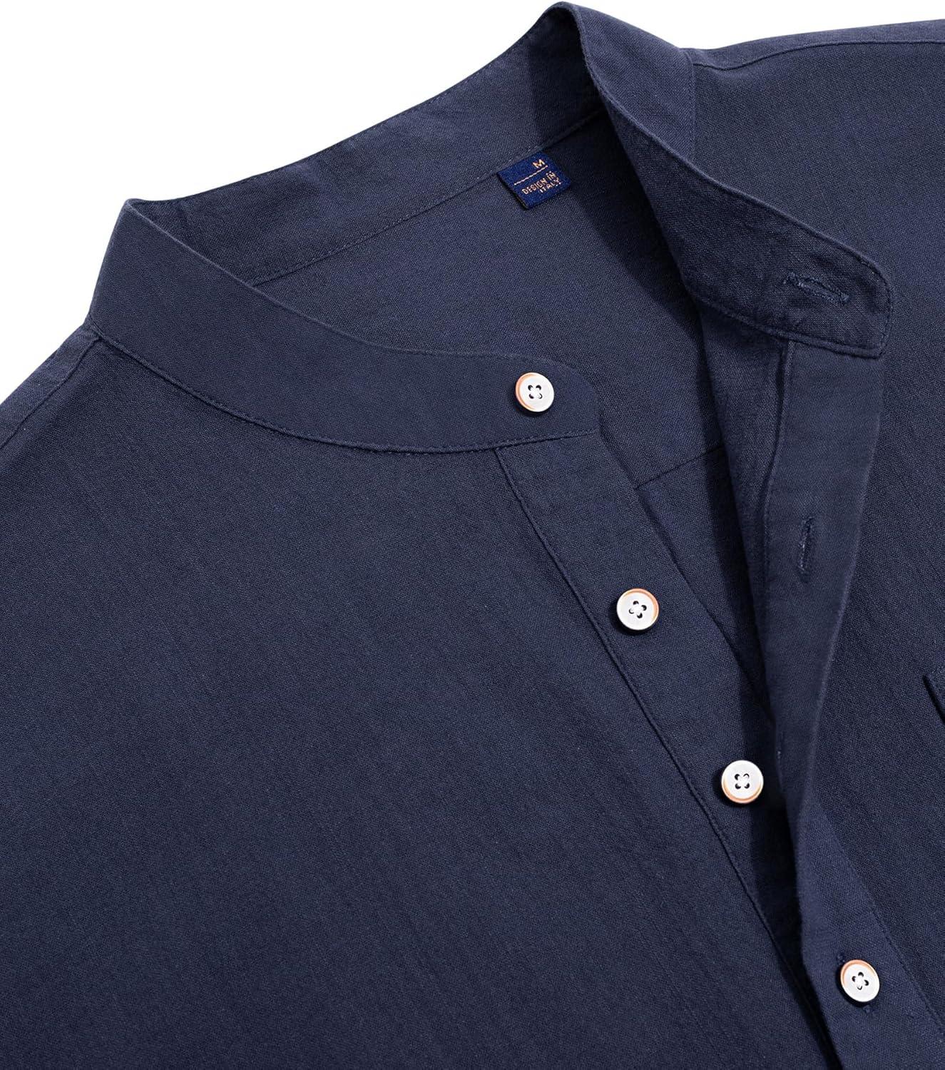 J.VER Men’s Cotton Linen Long Sleeve Shirts Casual Button Down Banded Collar Shirt Beach Summer Tops with Pocket(Navy Blue)