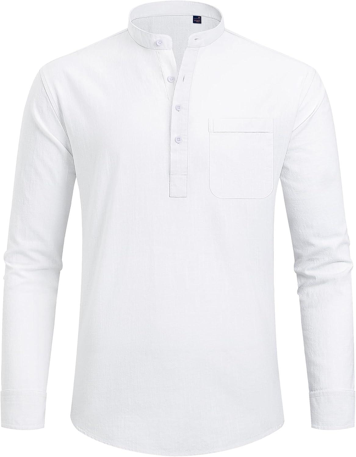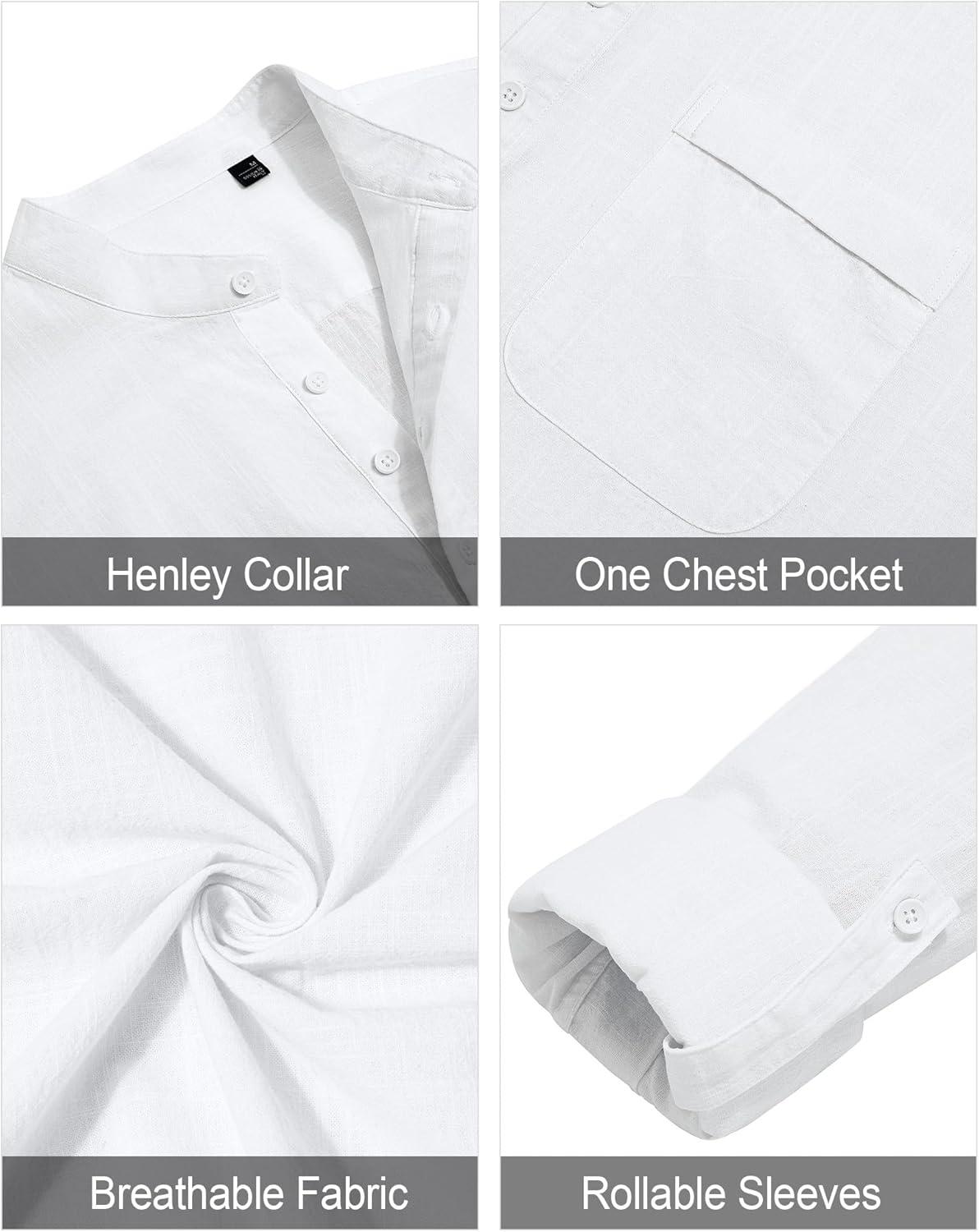 J.VER Men’s Linen Roll Up Long Sleeve Shirt Cotton Casual Beach Shirts Henley T-Shirt Band Collar Vacation Tops with Pocket(A-white)