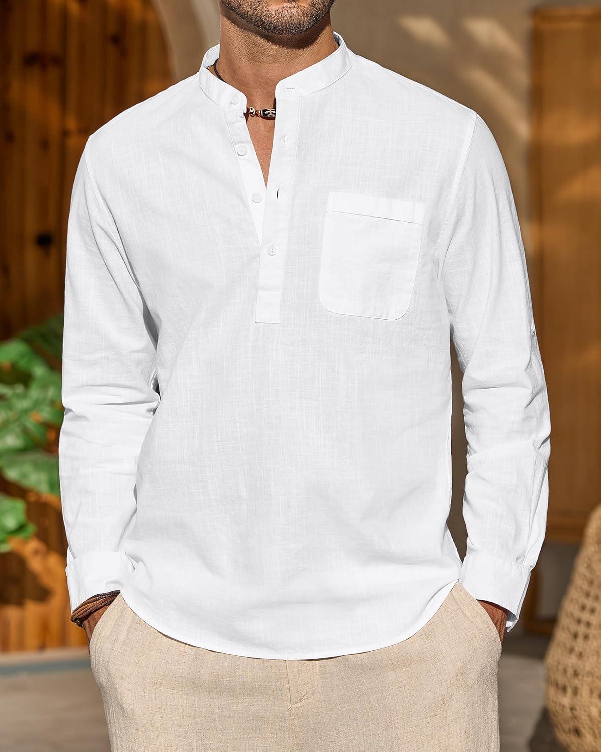 J.VER Men's Linen Roll Up Long Sleeve Shirt Cotton Casual Beach Shirts Henley T-Shirt Band Collar Vacation Tops with Pocket(A-white)