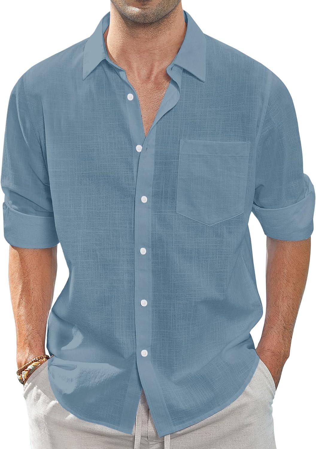 J.VER Men’s Linen Shirts Casual Button Down Long Sleeve Shirt Solid Spread Collar Summer Beach Shirts with Pocket(Airy Blue)
