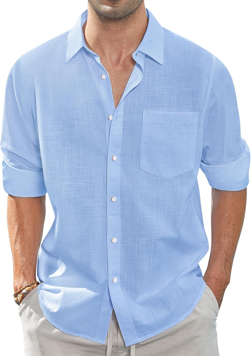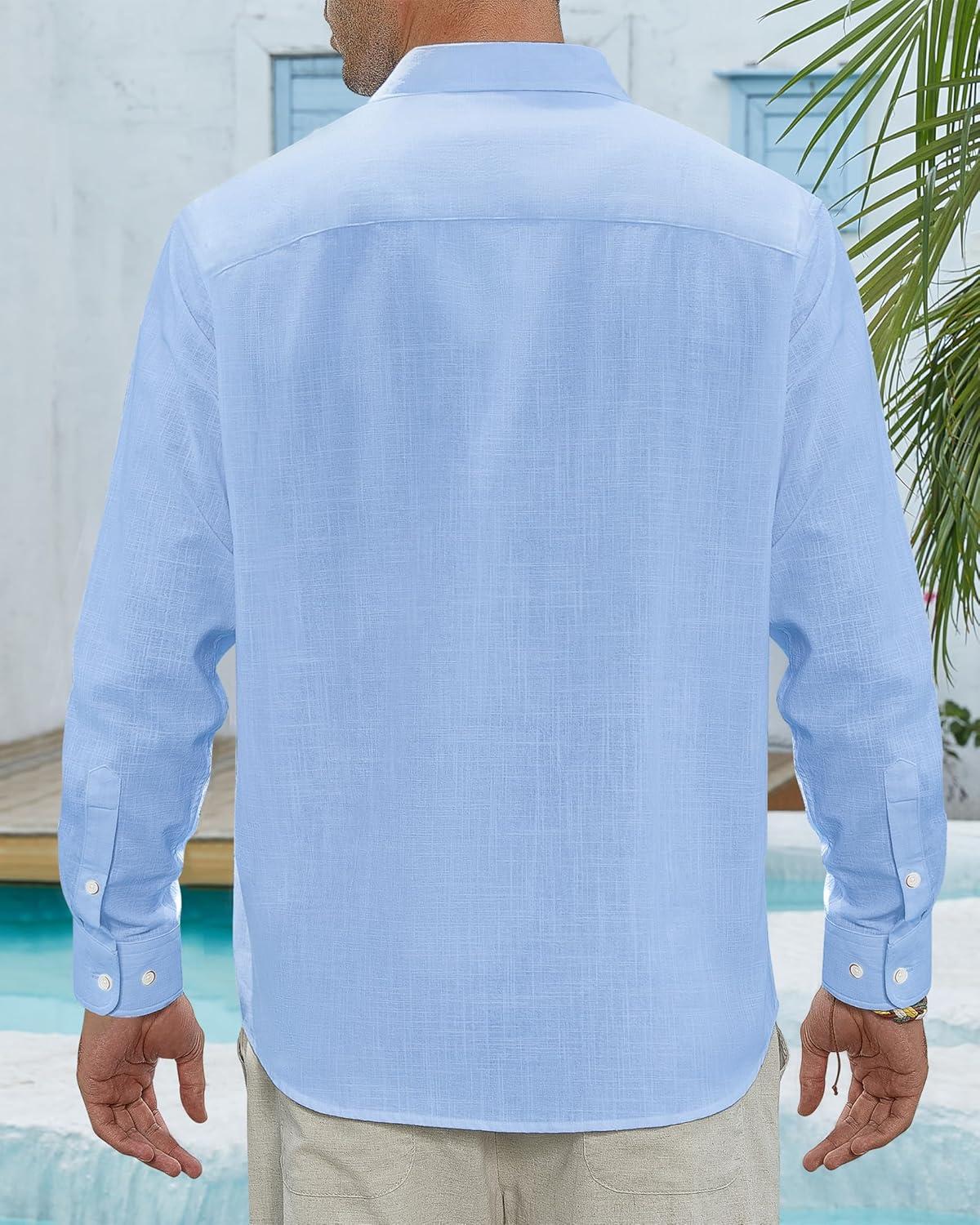 J.VER Men’s Linen Shirts Casual Button Down Long Sleeve Shirt Solid Spread Collar Summer Beach Shirts with Pocket(Light Blue)