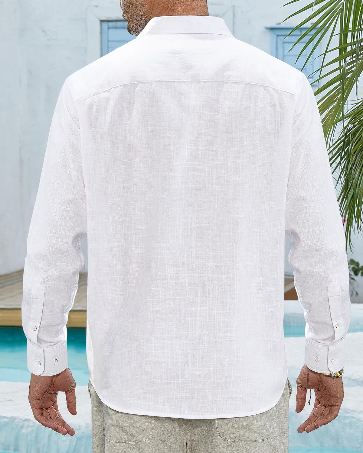 J.VER Men's Linen Shirts Casual Button Down Long Sleeve Shirt Solid Spread Collar Summer Beach Shirts with Pocket(White)