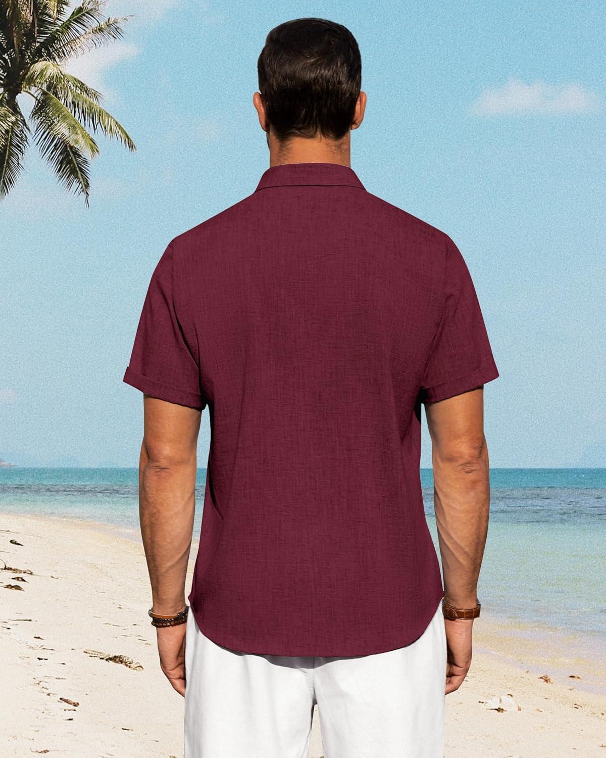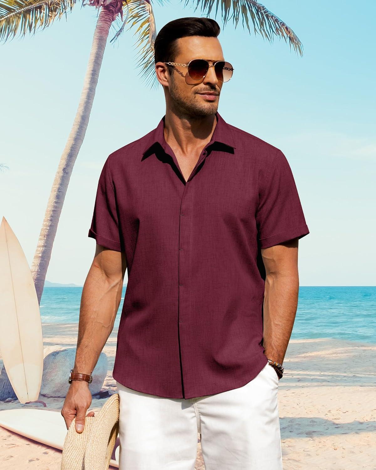 J.VER Men's Linen Shirts Casual Short Sleeve Button Down Shirt Beach Summer Vacation Holiday Wedding Cotton Tops(Burgundy)