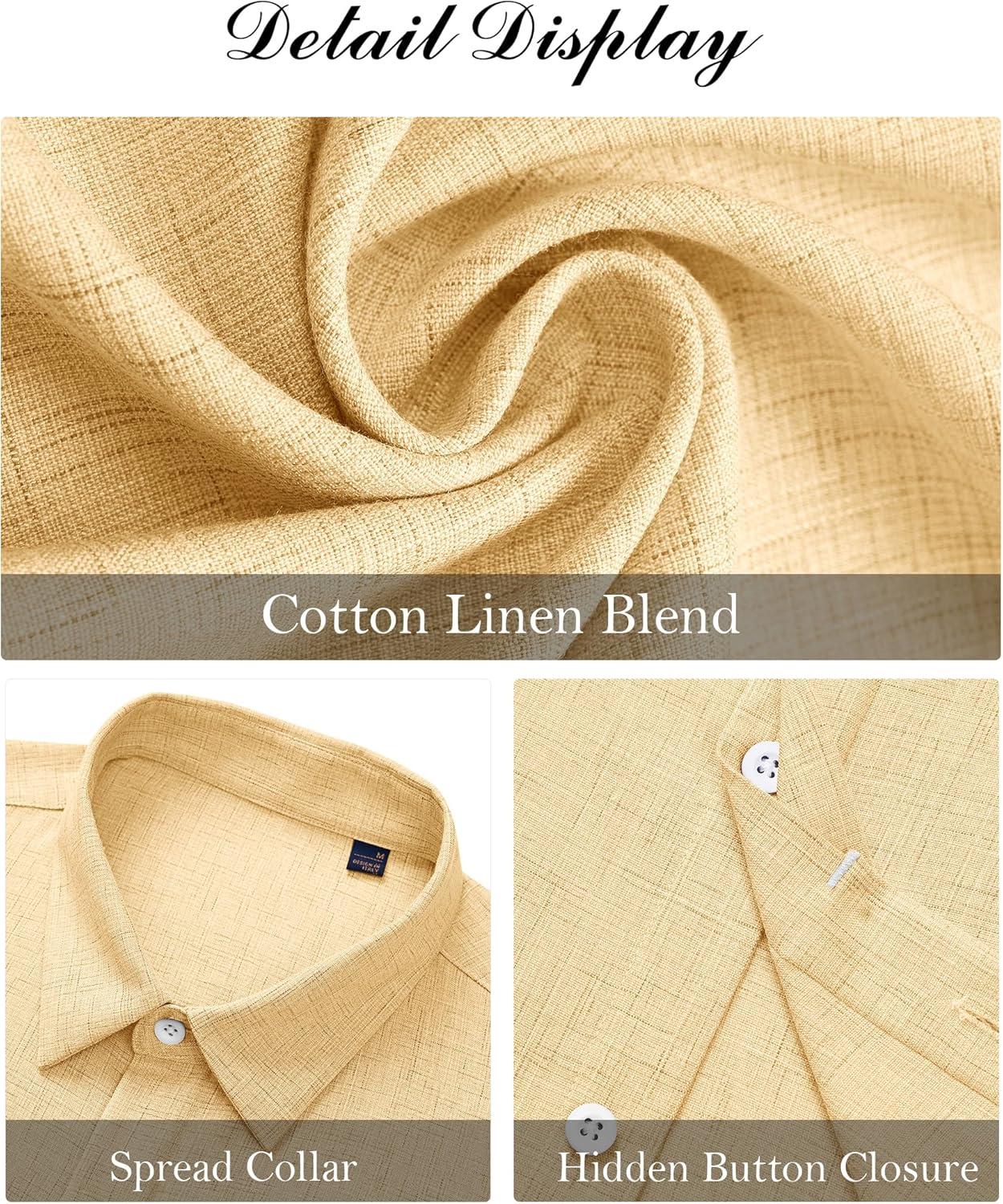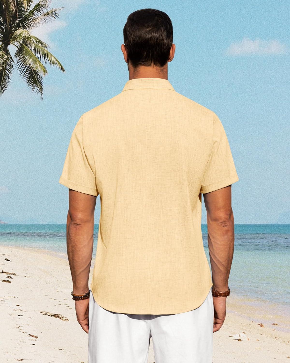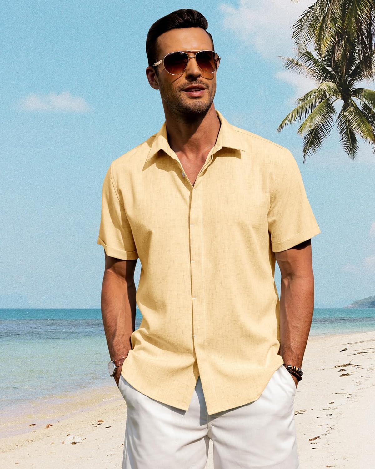 J.VER Men's Linen Shirts Casual Short Sleeve Button Down Shirt Beach Summer Vacation Holiday Wedding Cotton Tops(Yellow)