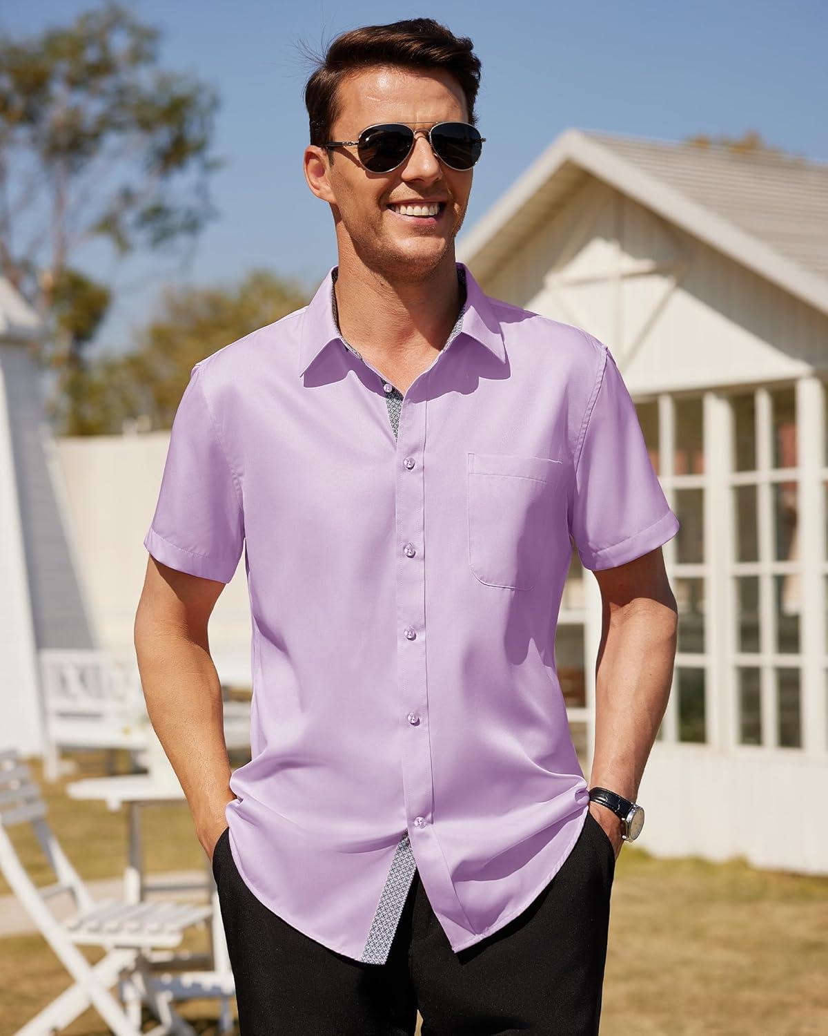 imageJVER Mens Short Sleeve Dress Shirts Stretch Wrinkle Free Casual Button Down Shirts with Pocket for Business WeddingLight Purple