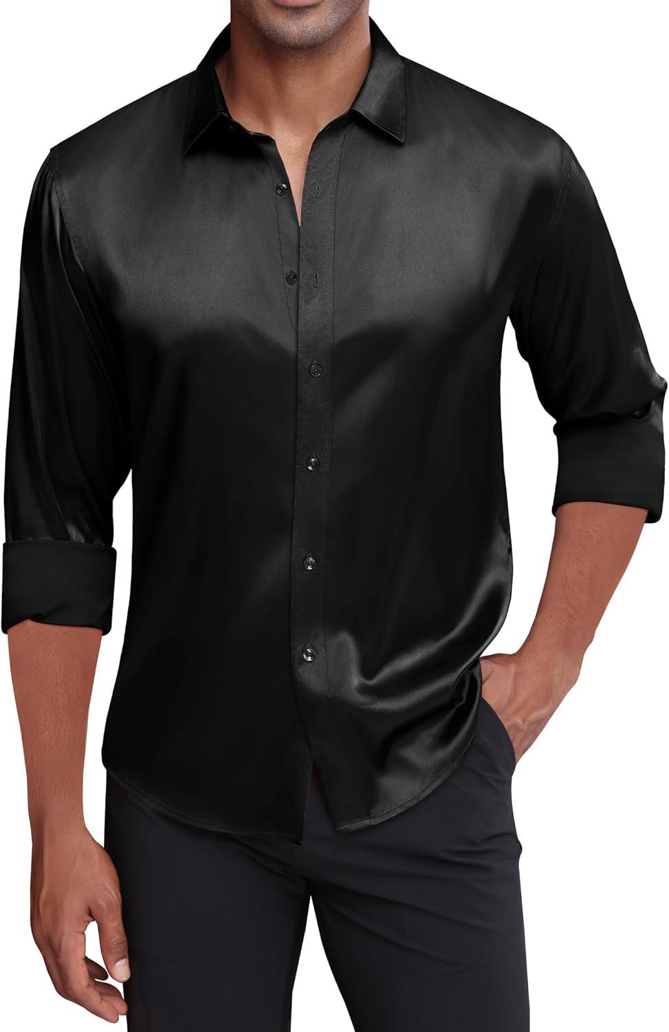 J.VER Men’s Silk Satin Long Sleeve Dress Shirts Shiny Casual Button Down Shirt Luxury Party Prom Shirts(Black)