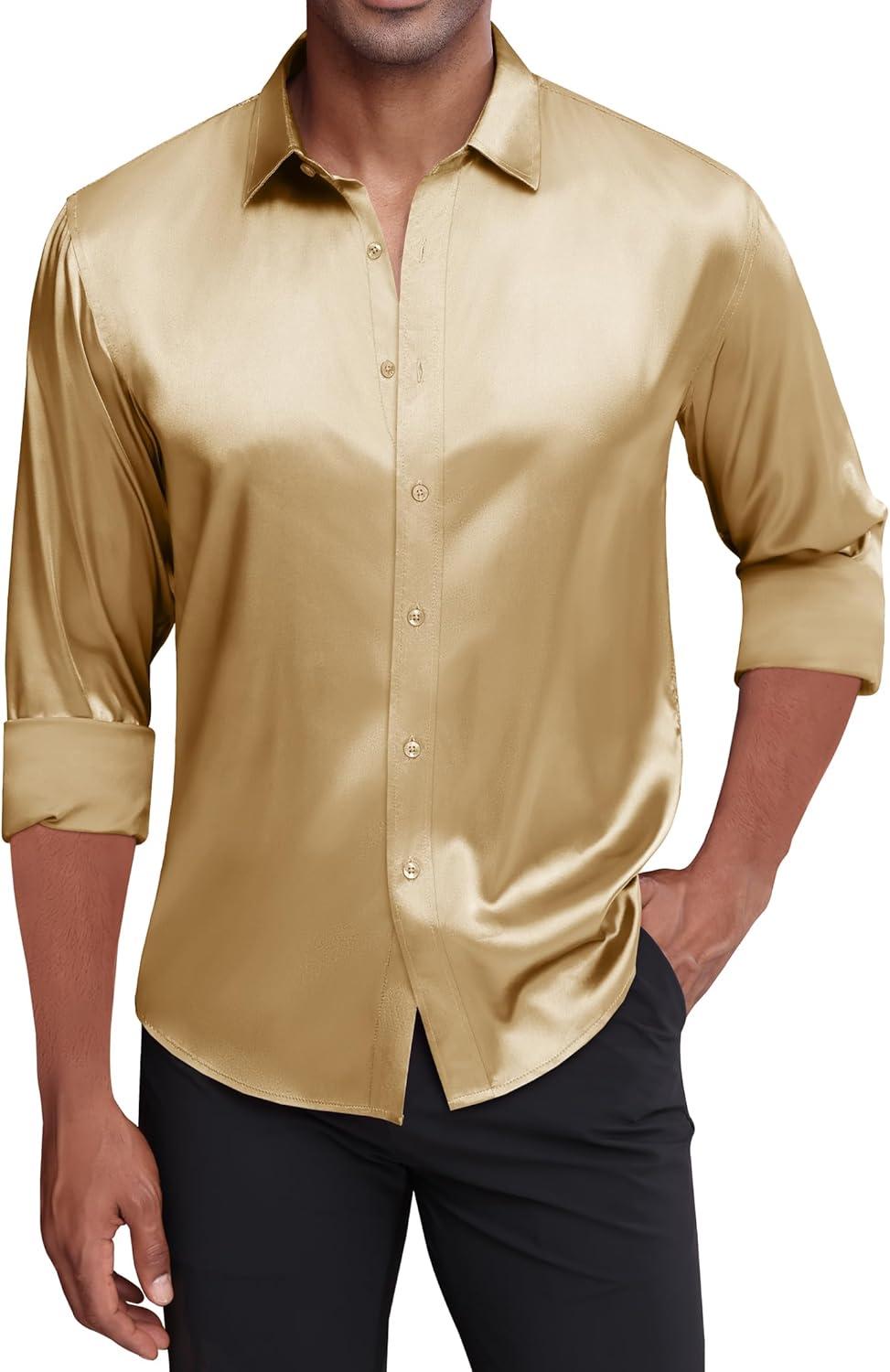 J.VER Men’s Silk Satin Long Sleeve Dress Shirts Shiny Casual Button Down Shirt Luxury Party Prom Shirts(Gold)