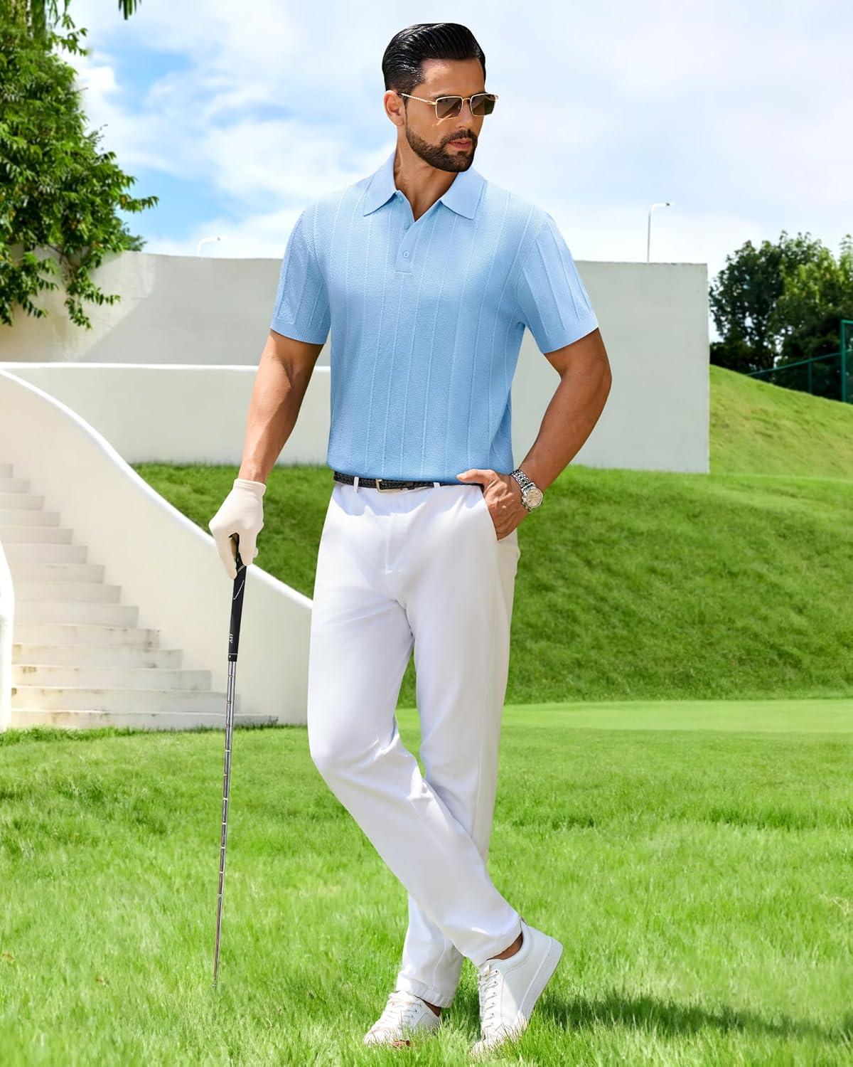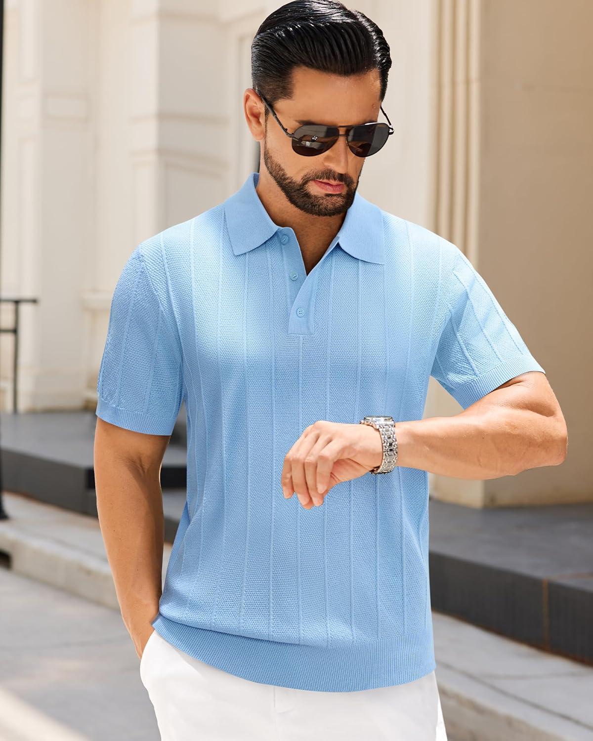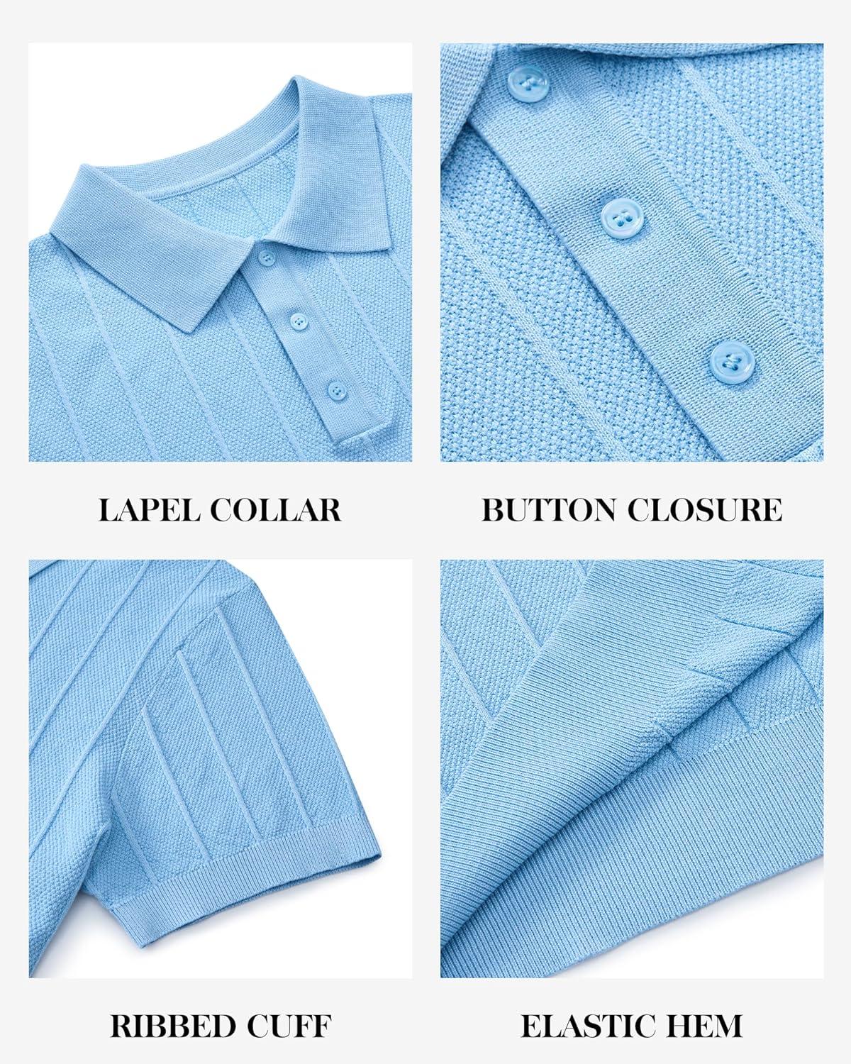 J.VER Polo Shirts for Men Short Sleeve Ribbed Textured Knit Shirt Stretch Casual Golf Tops(Blue)