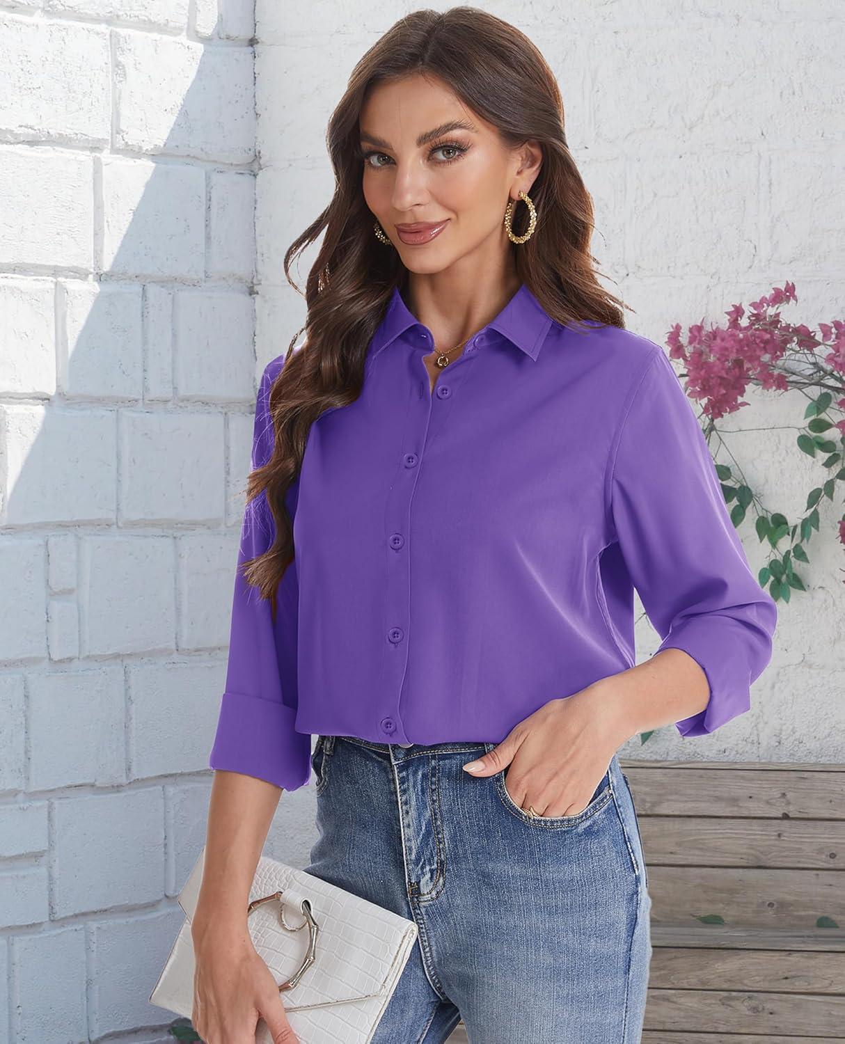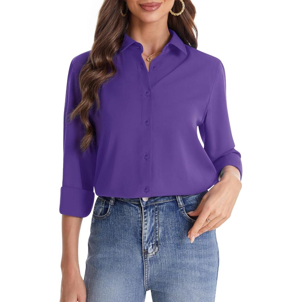 imageJVER Womens Button Down Shirt Long Sleeve Solid Dress Shirts Chiffon Work Office Blouse Fashion Formal Business Casual TopsDark Purple