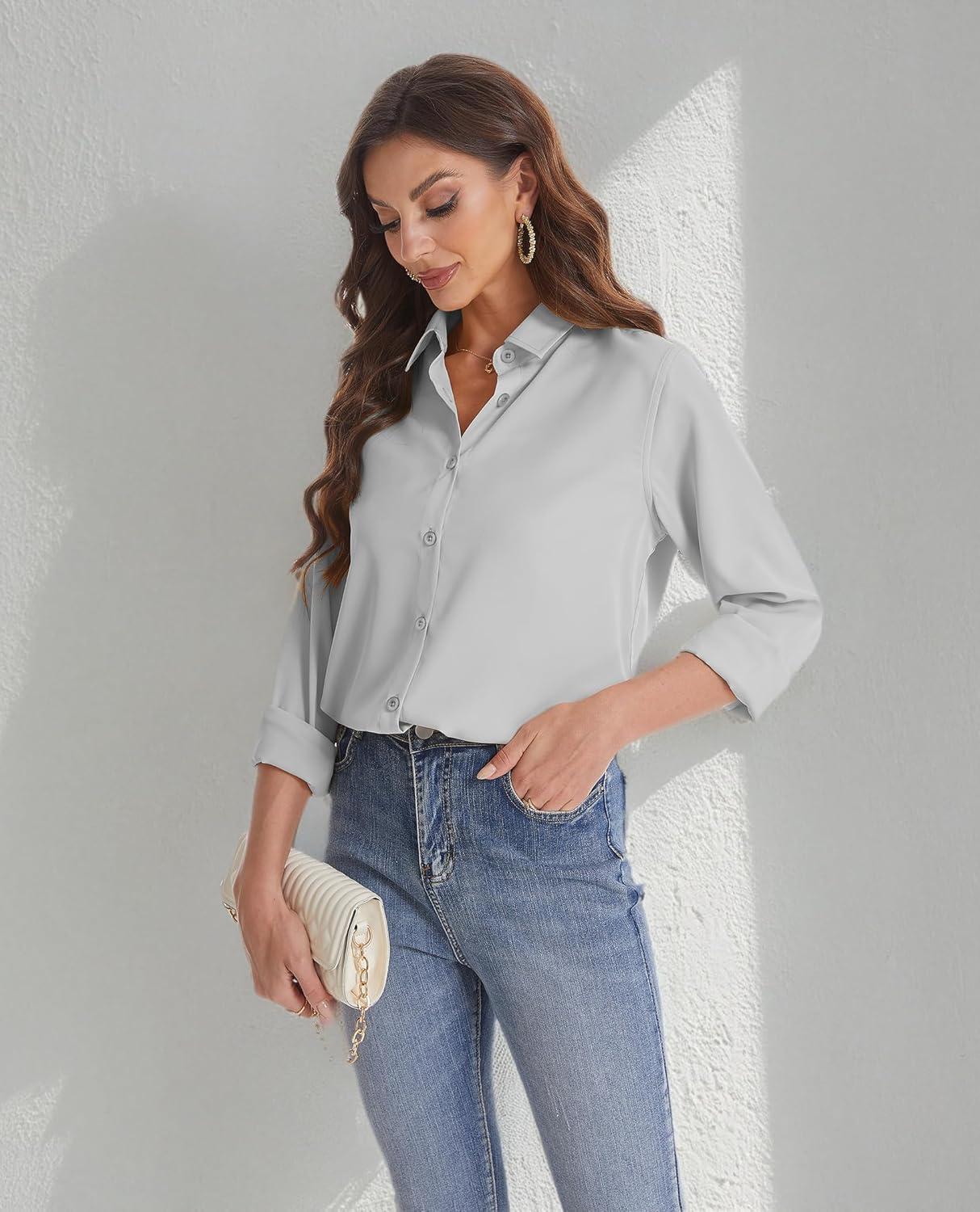 imageJVER Womens Button Down Shirt Long Sleeve Solid Dress Shirts Chiffon Work Office Blouse Fashion Formal Business Casual TopsLight Grey