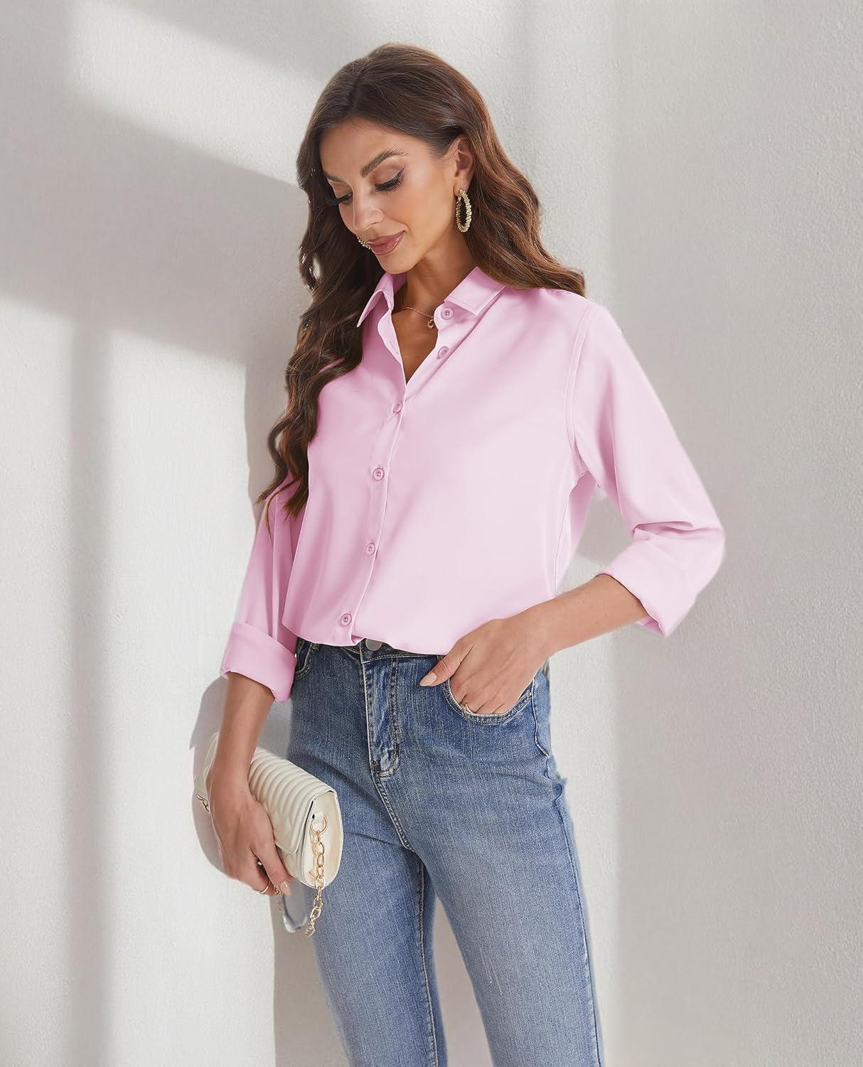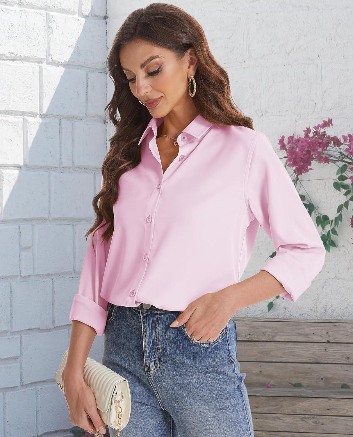 imageJVER Womens Button Down Shirt Long Sleeve Solid Dress Shirts Chiffon Work Office Blouse Fashion Formal Business Casual TopsLight Pink
