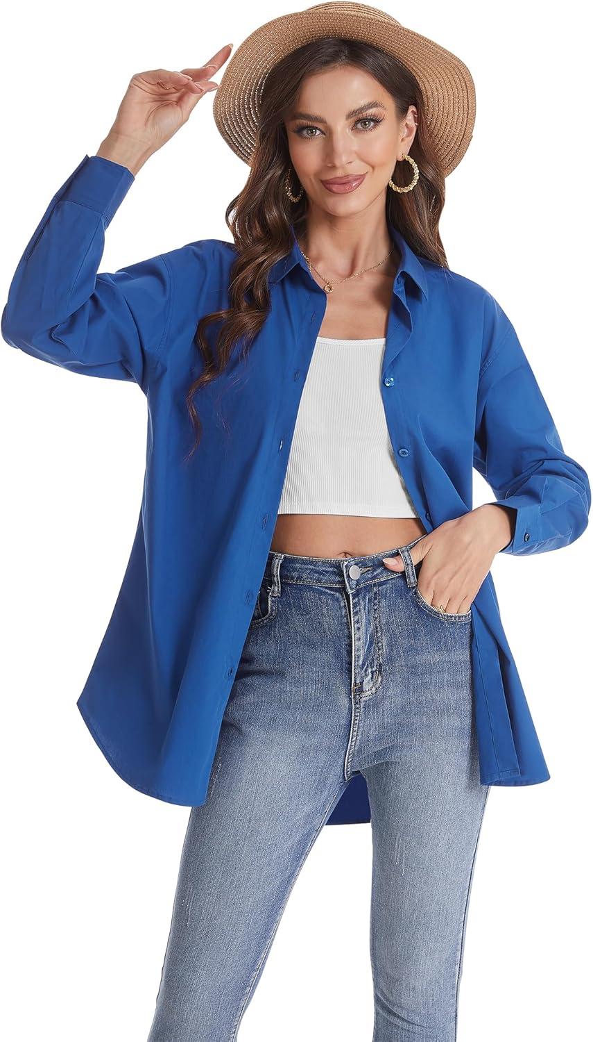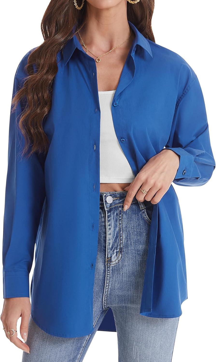 J.VER Womens Oversized Button Down Shirts Casual Long Sleeve Lightweight Breathable Solid Cotton Blouse Office Dress Shirt(Indigo Blue)
