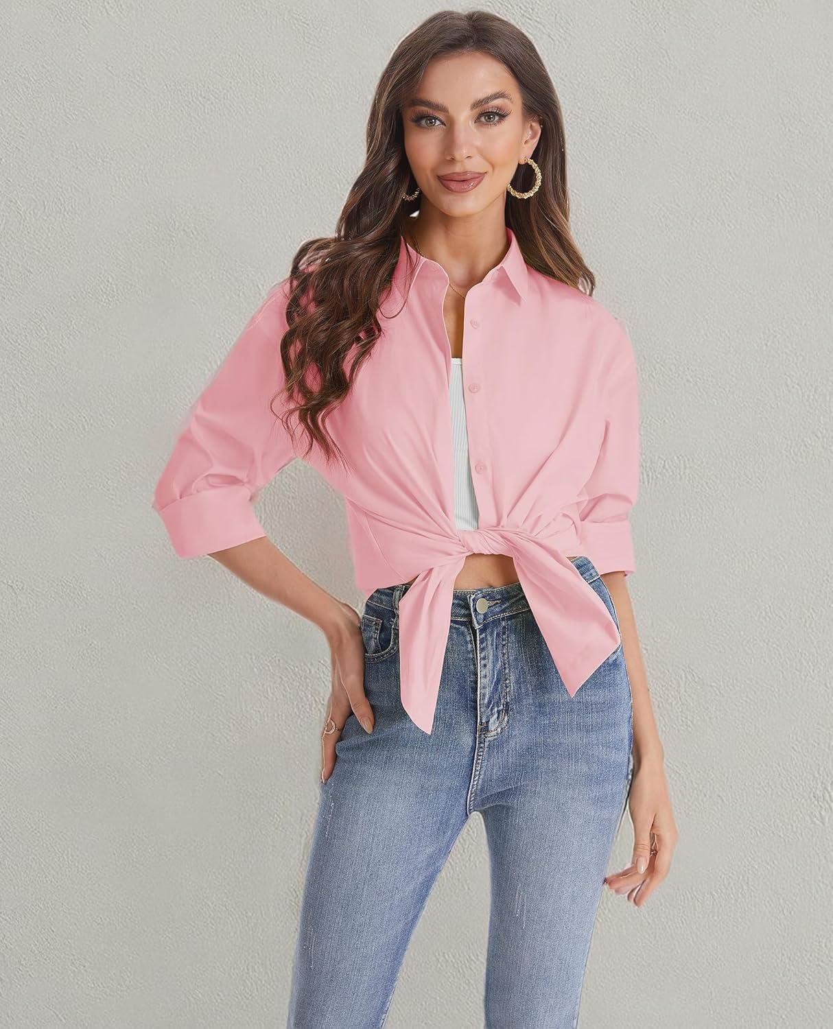 imageJVER Womens Oversized Button Down Shirts Casual Long Sleeve Lightweight Breathable Solid Cotton Blouse Office Dress ShirtPink