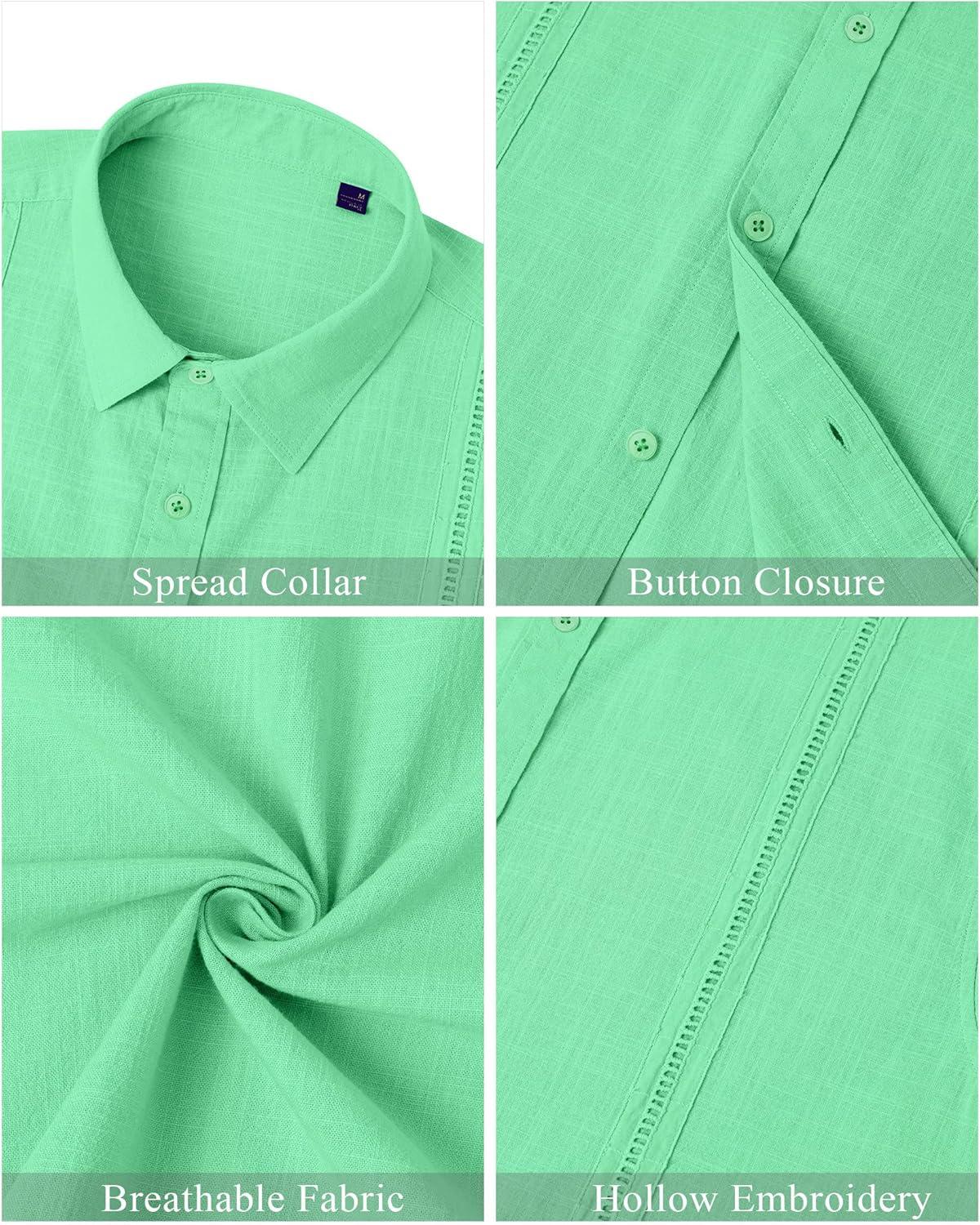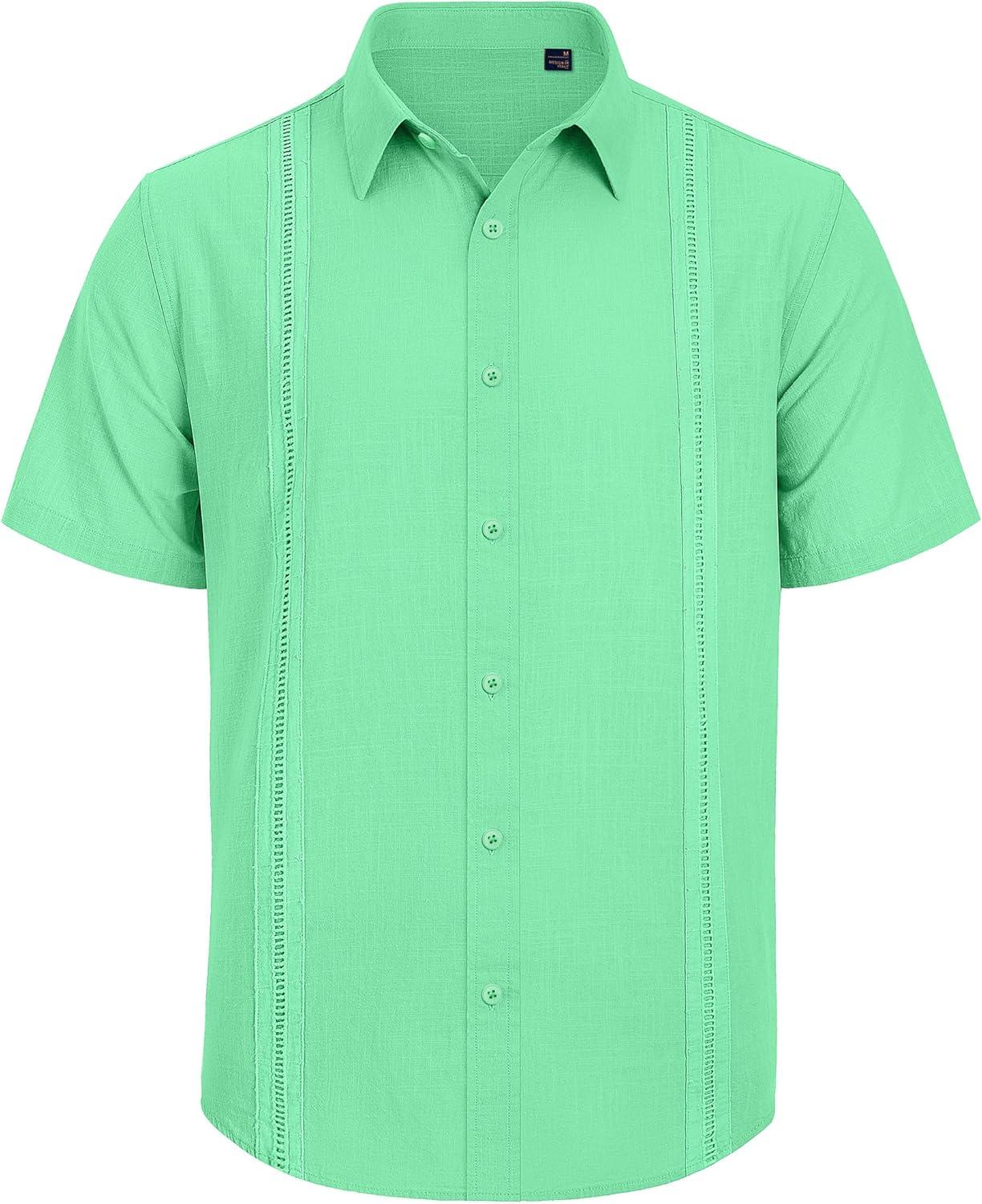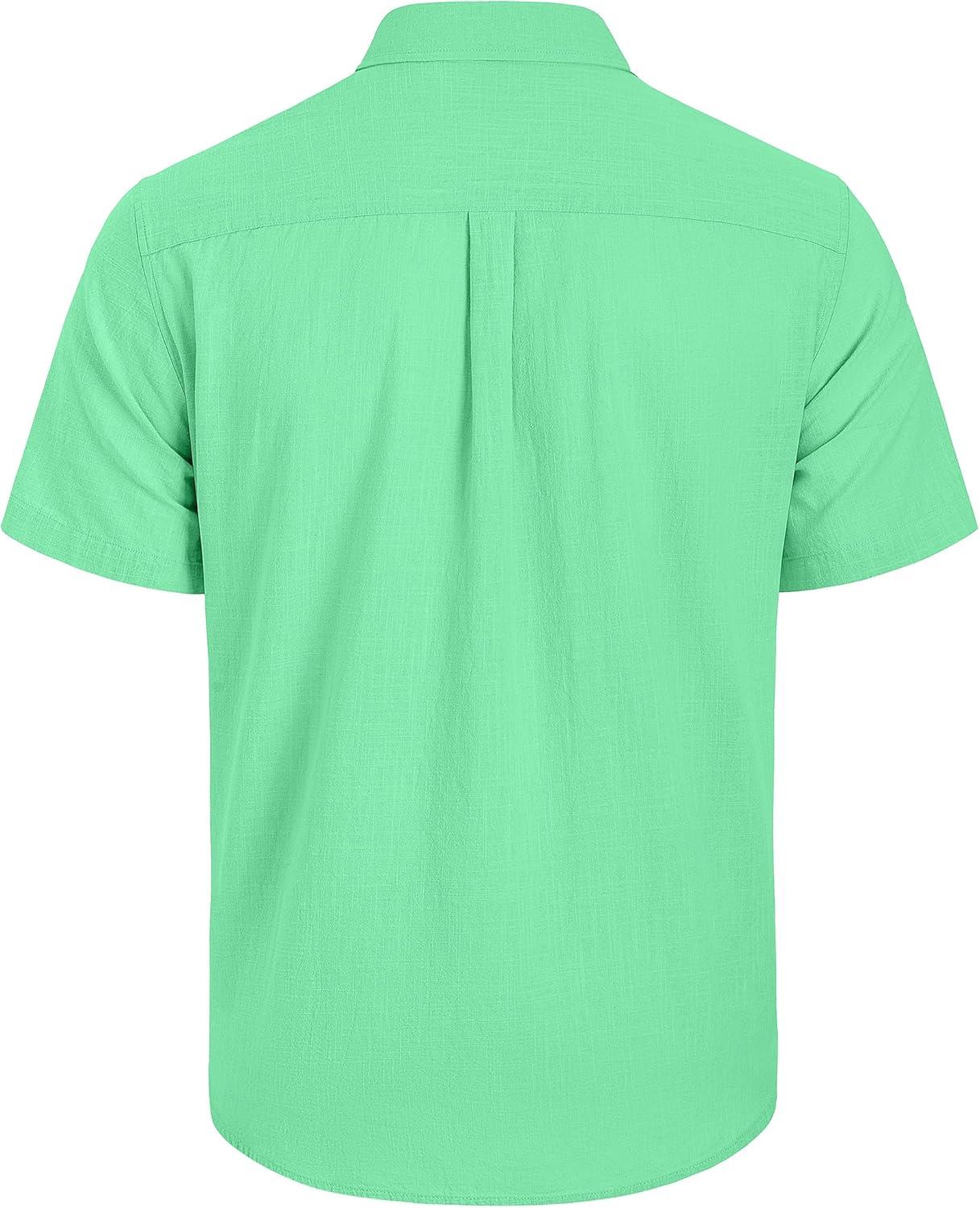 Mens Linen Shirts Short Sleeve Button Down Shirt Casual Cuban Guayabera Lightweight Summer Beach Solid Tops(Bright Green)