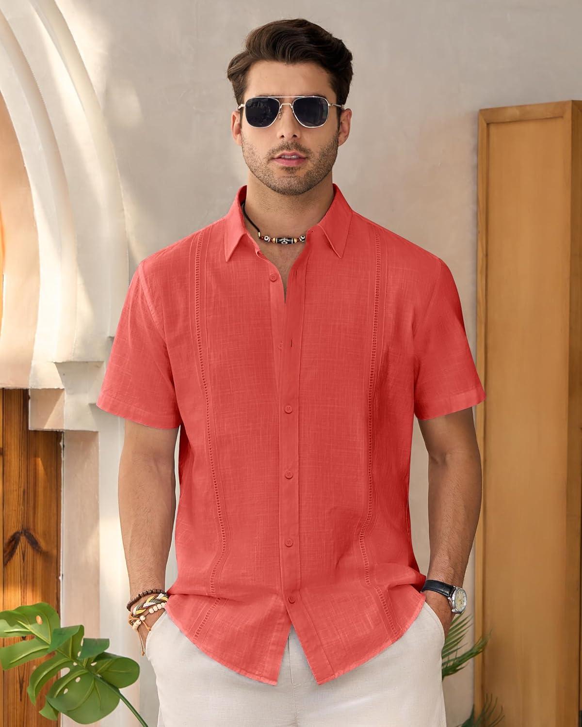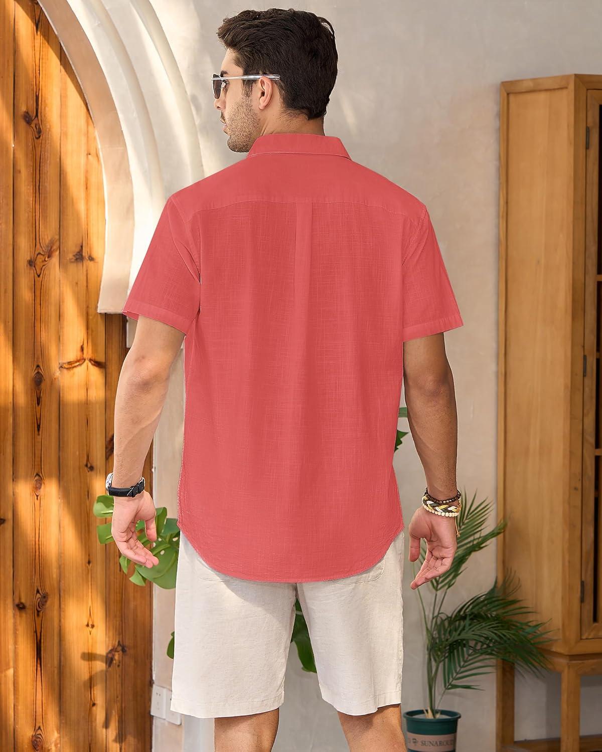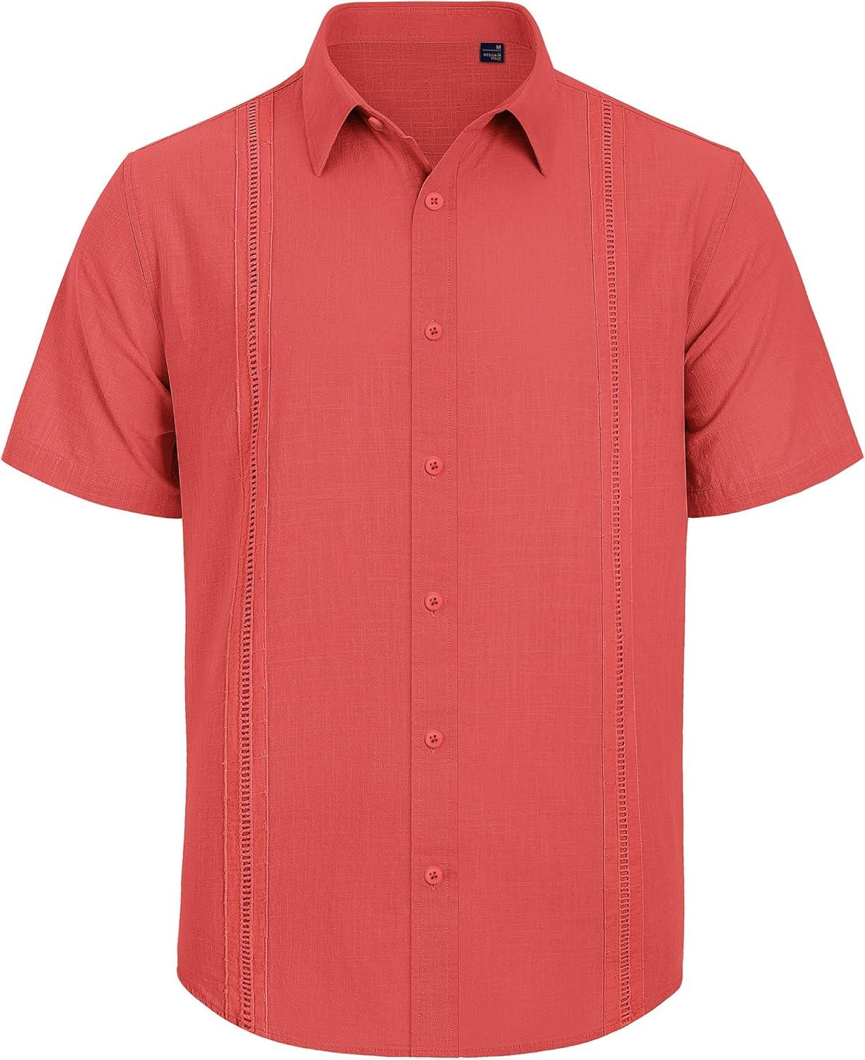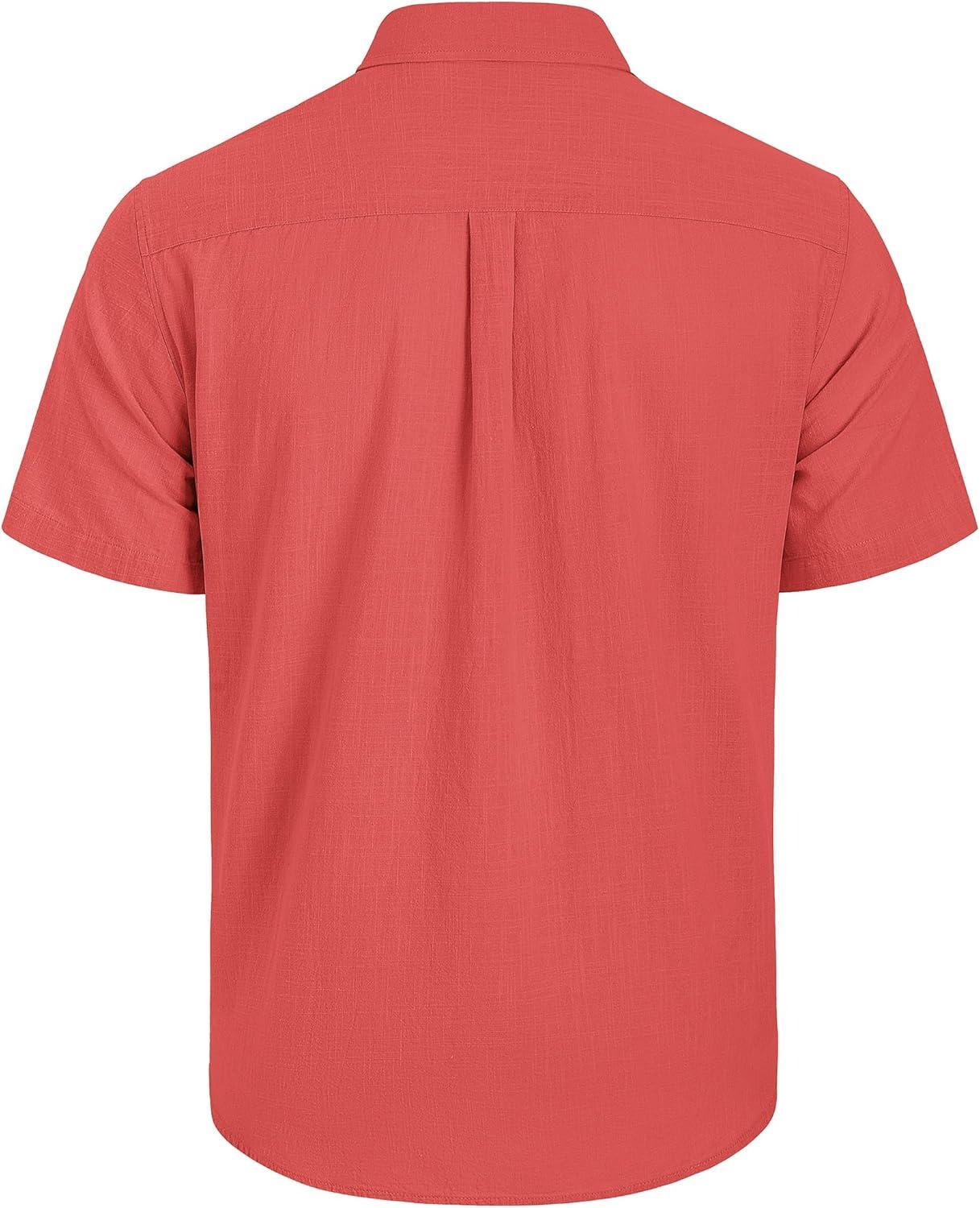 Mens Linen Shirts Short Sleeve Button Down Shirt Casual Cuban Guayabera Lightweight Summer Beach Solid Tops(Coral)