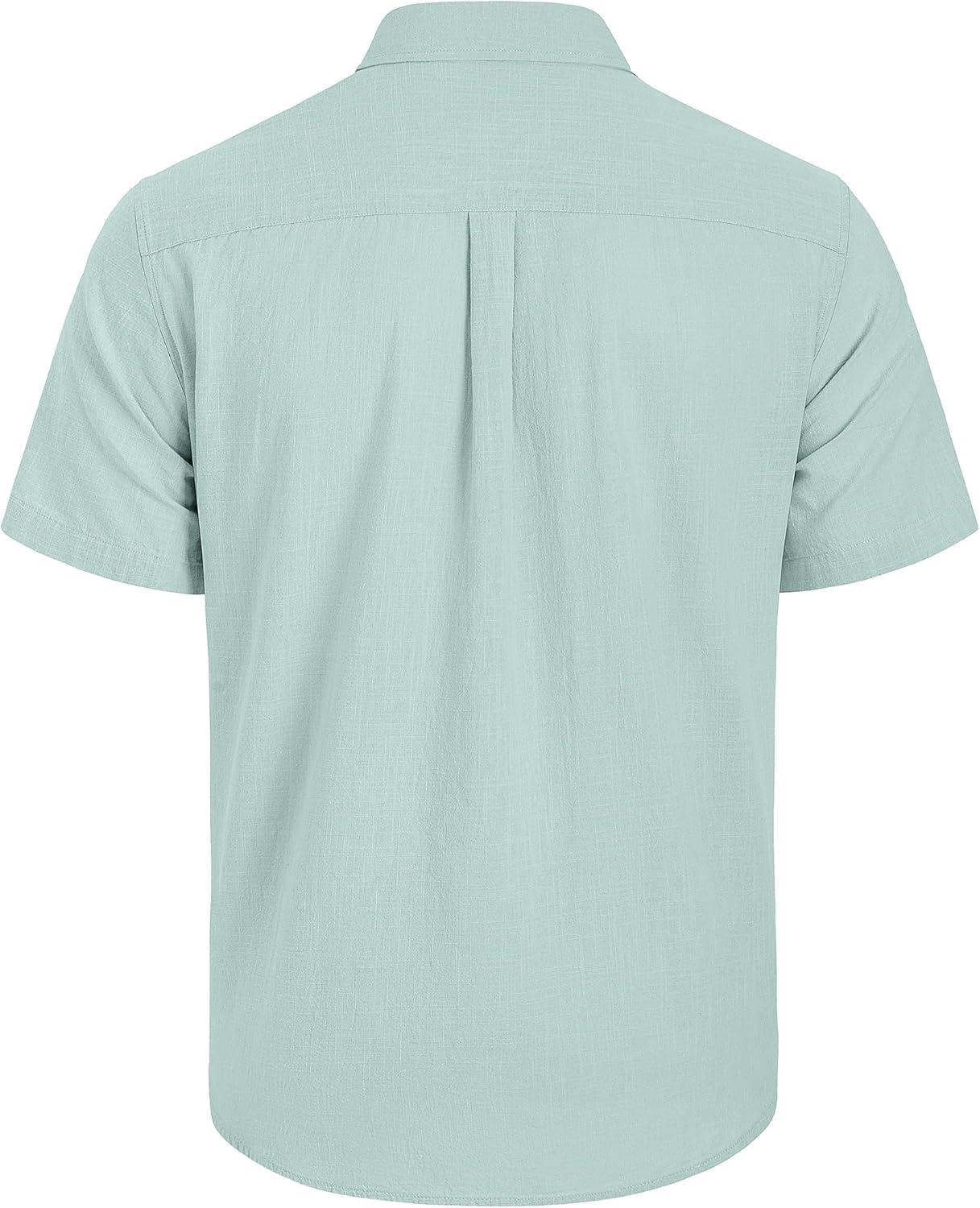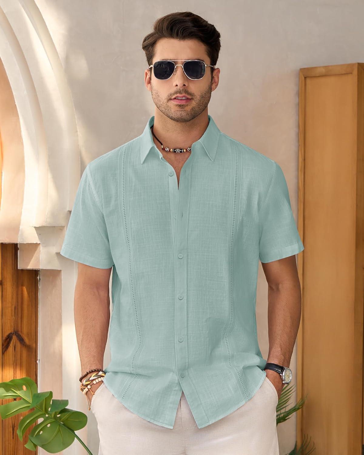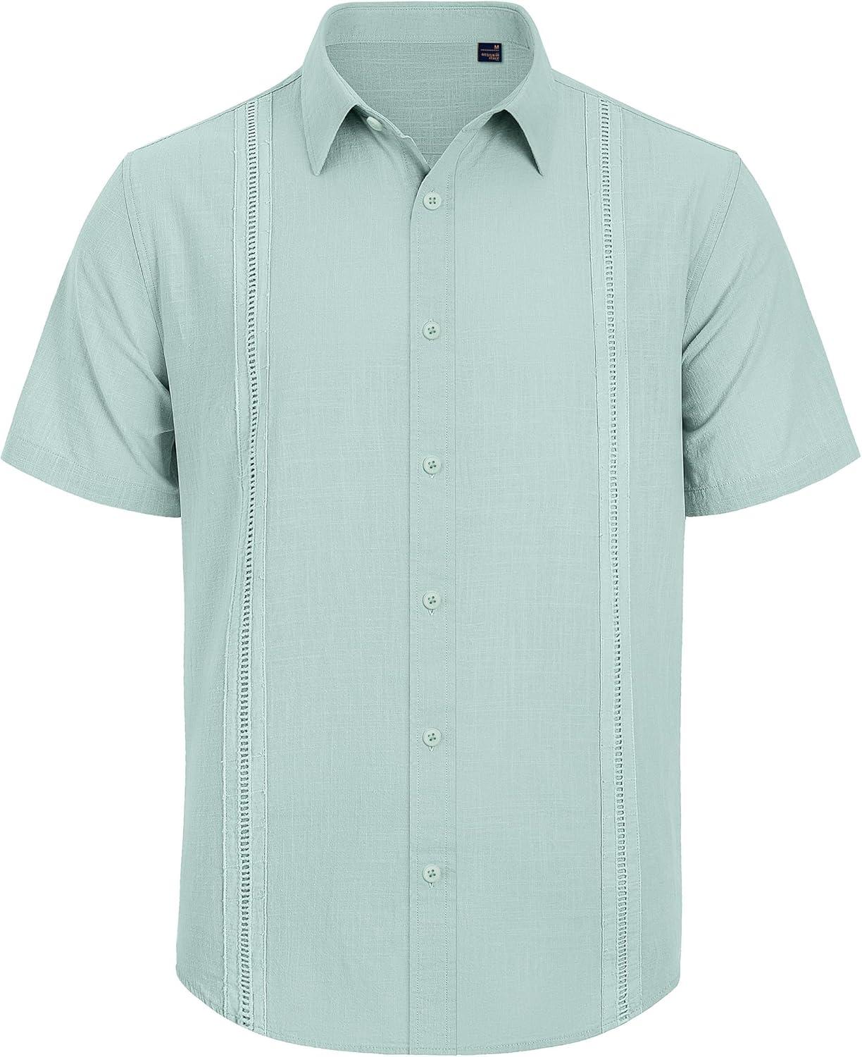 Mens Linen Shirts Short Sleeve Button Down Shirt Casual Cuban Guayabera Lightweight Summer Beach Solid Tops(Grey Green)