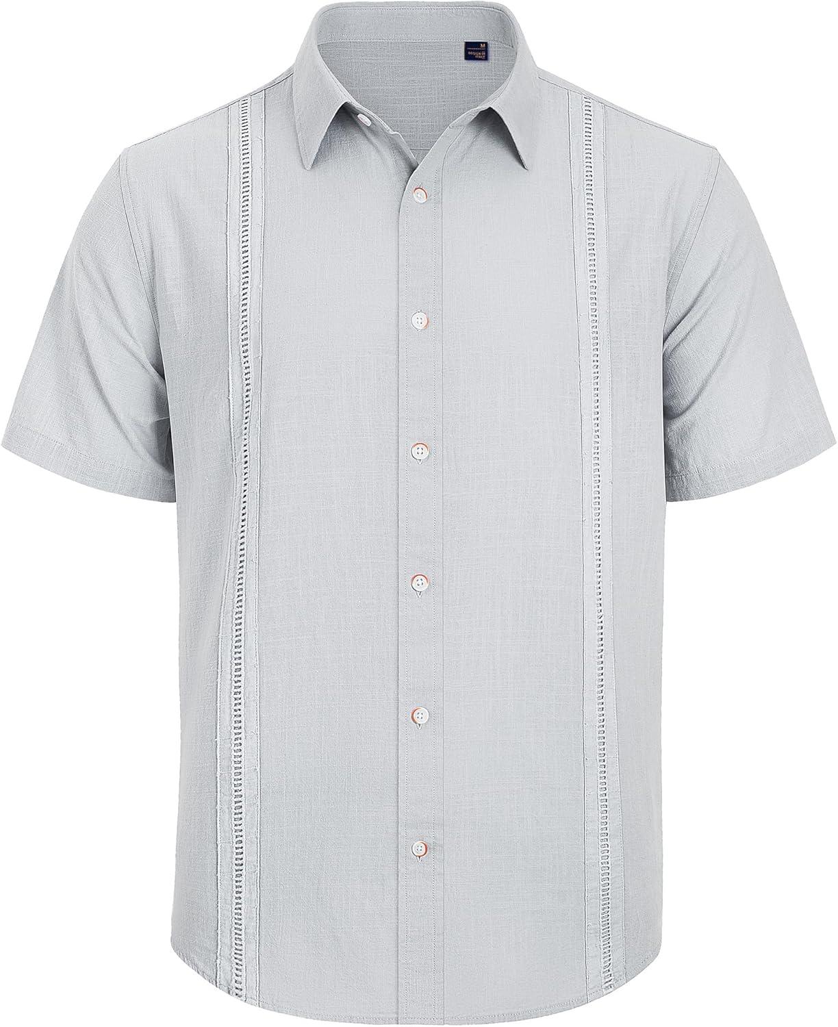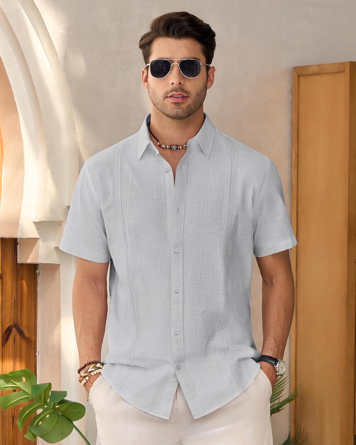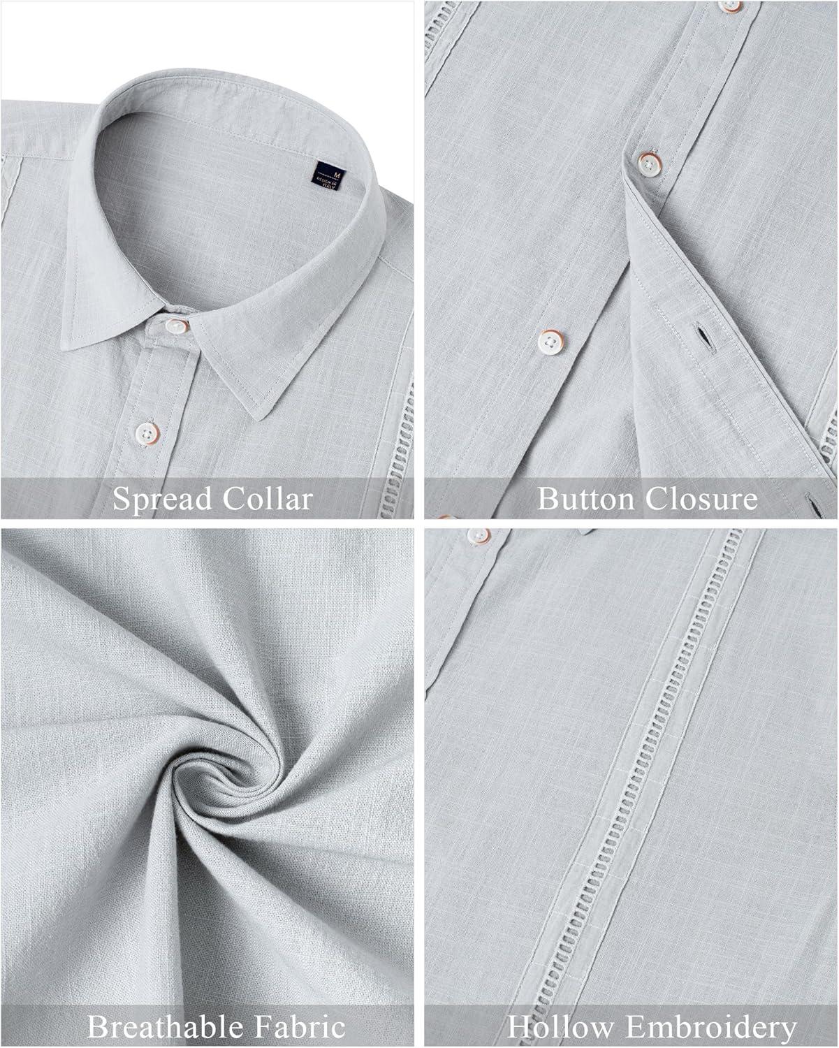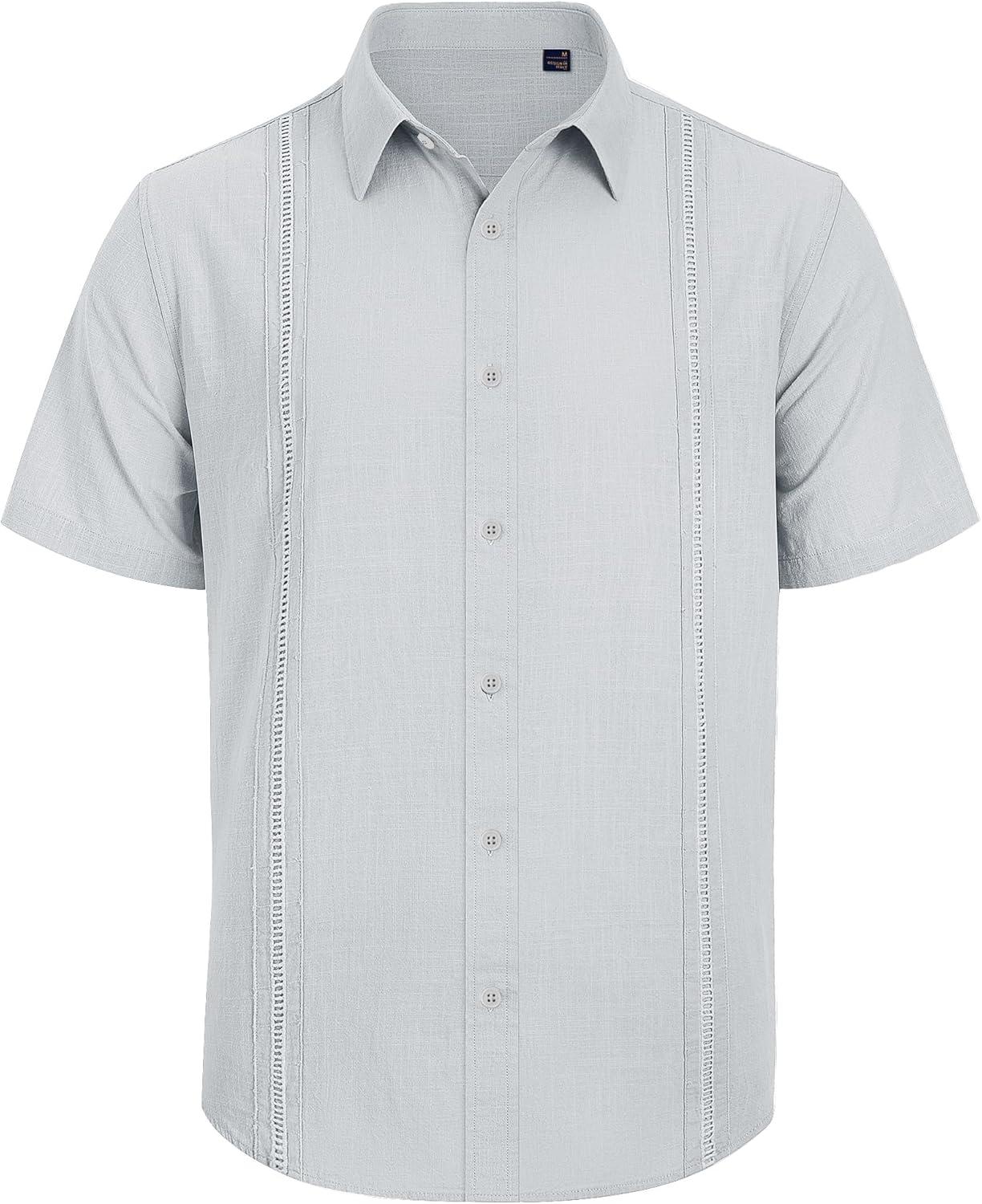 Mens Linen Shirts Short Sleeve Button Down Shirt Casual Cuban Guayabera Lightweight Summer Beach Solid Tops(Grey)