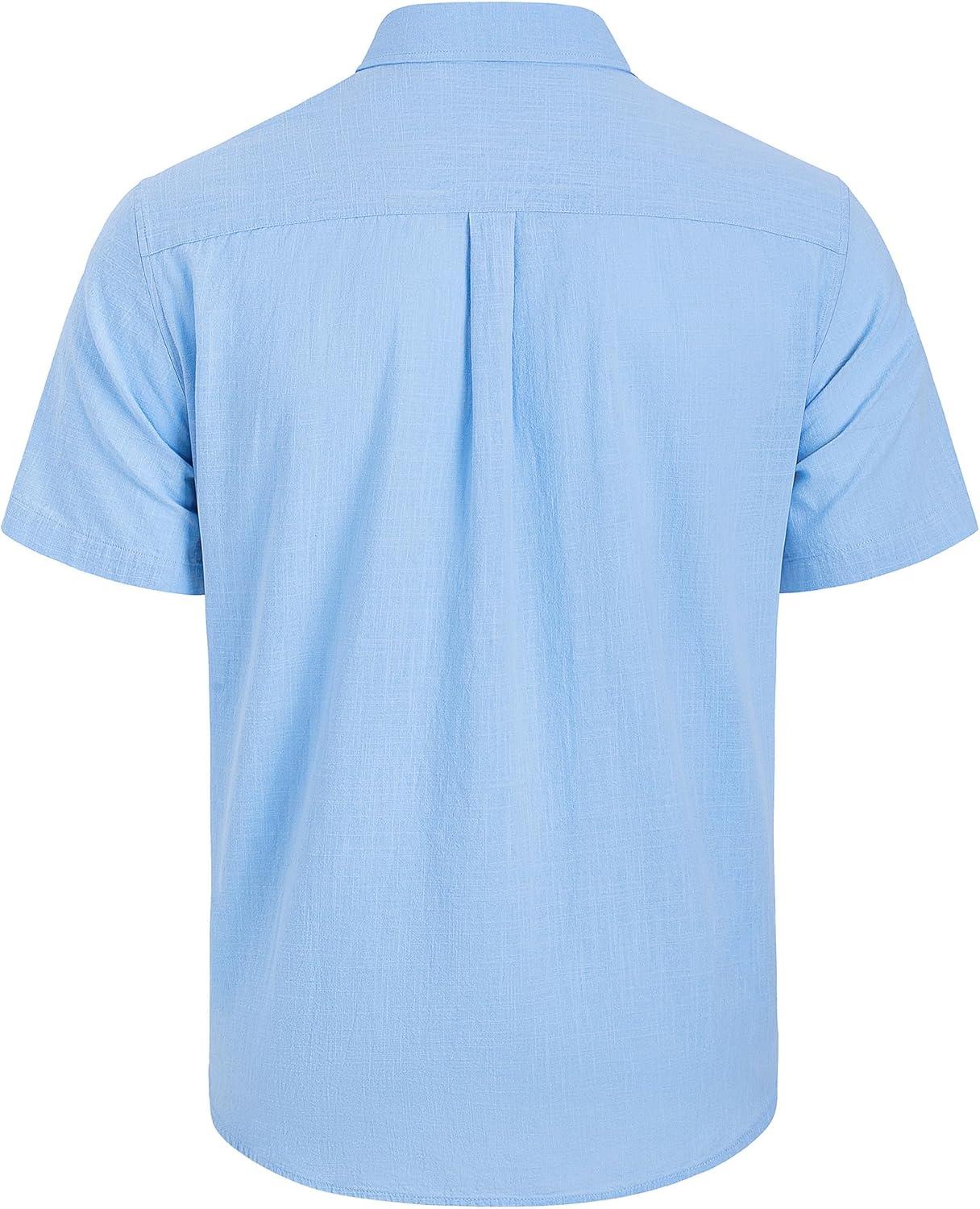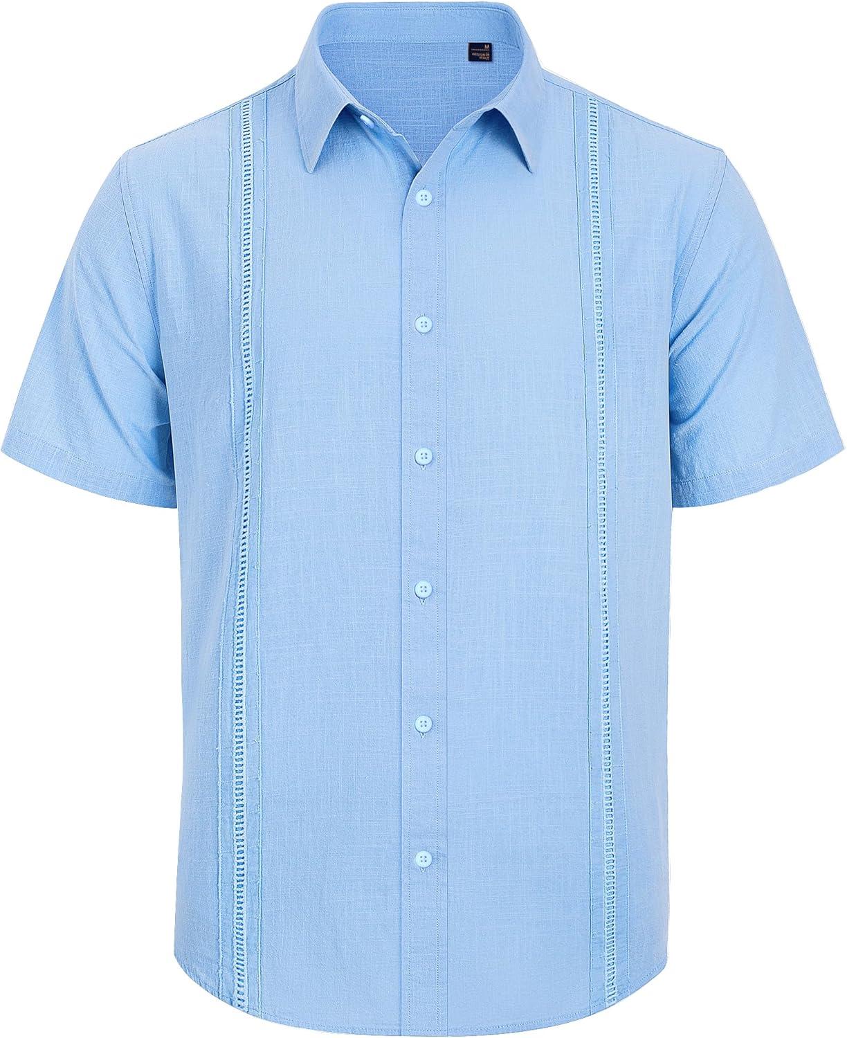 Mens Linen Shirts Short Sleeve Button Down Shirt Casual Cuban Guayabera Lightweight Summer Beach Solid Tops(Light Blue)