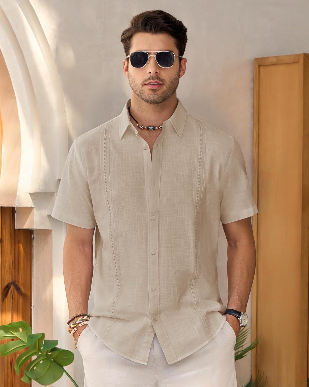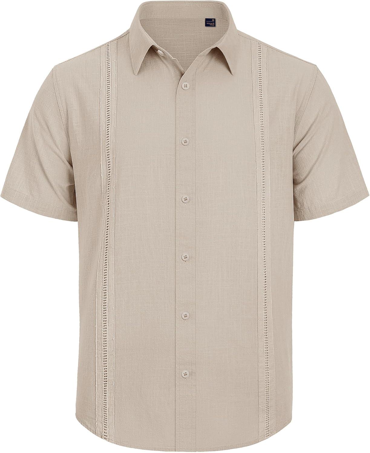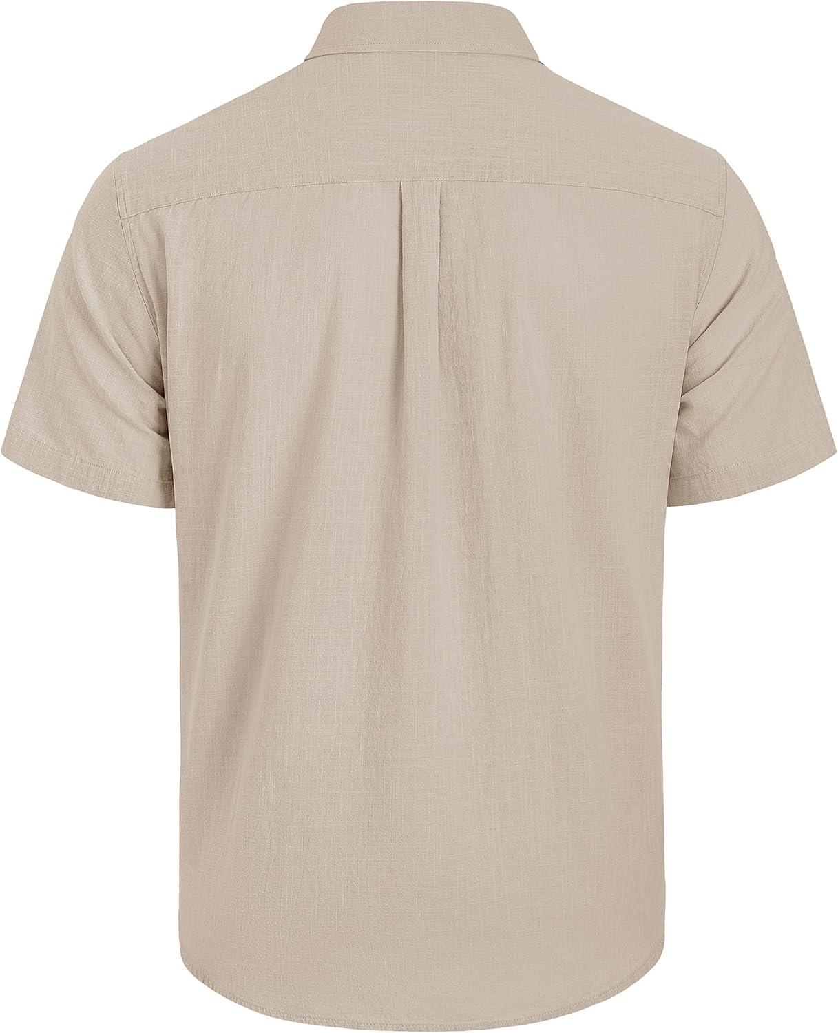 Mens Linen Shirts Short Sleeve Button Down Shirt Casual Cuban Guayabera Lightweight Summer Beach Solid Tops(Light Khaki)
